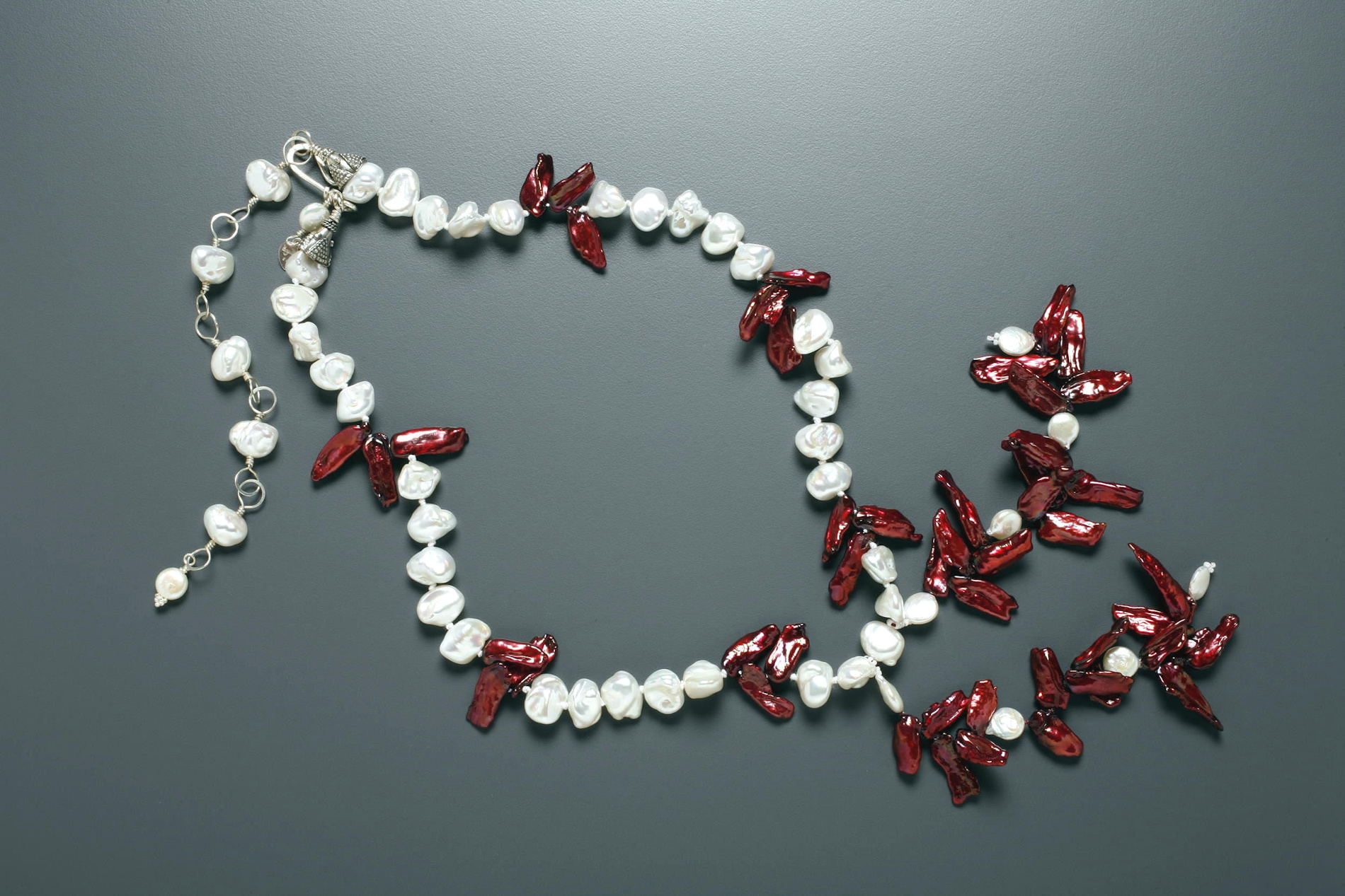 Don't the fabulous red pearls look like chile peppers? Really, they are pearls though they're dyed a color nature never intended. They are nonetheless great for warming up a snowy day or outfit. The white pearls are marvelously lustrous. The composition is hand knotted on silk. This piece, like many, may prompt the question: what is the necklace length measurement exactly? It is the length of the part that encircles the neck, not including any dangles. If you click on the "About Virgo Moon" link just below you'll find a diagram showing what the measurements mean. Before you go, I hope you'll add this pretty necklace to your shopping cart!