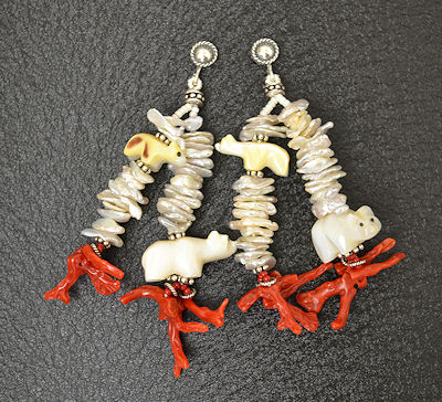 What is this gorgeous bear made of? The Wiki article on mother of pearl or nacre explains. The bear is carved from an unusually beautiful piece which glows with rainbow colors. The bear is in medicine pose with her head down, and has a coral heartline on the left side only. The carver did not gift her with a bundle so to connect her with the necklace I added a shell point, Daryl Shack Sr.'s lovely rainbird (with inlaid eyes) and a bit of coral. Daryl's baby bear and abalone fish are included in the pendant. The earrings have more of his baby bears.