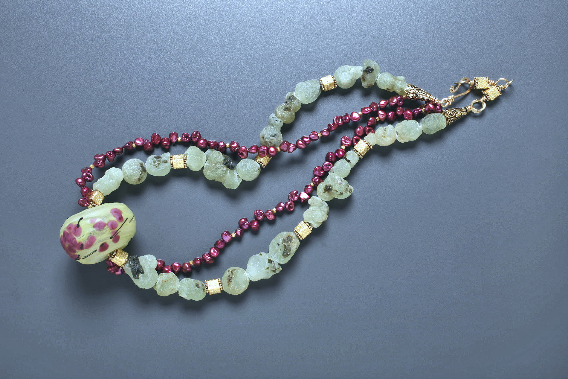 Karen's yummy hollow-formed bead sits at the center of this happy composition. Its matte surface blends happily with the rough prehnite nuggets. Brilliantly dyed pearls echo the berries on the bead.