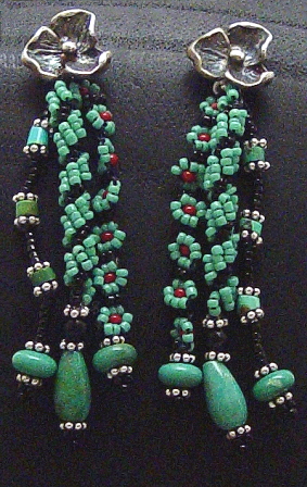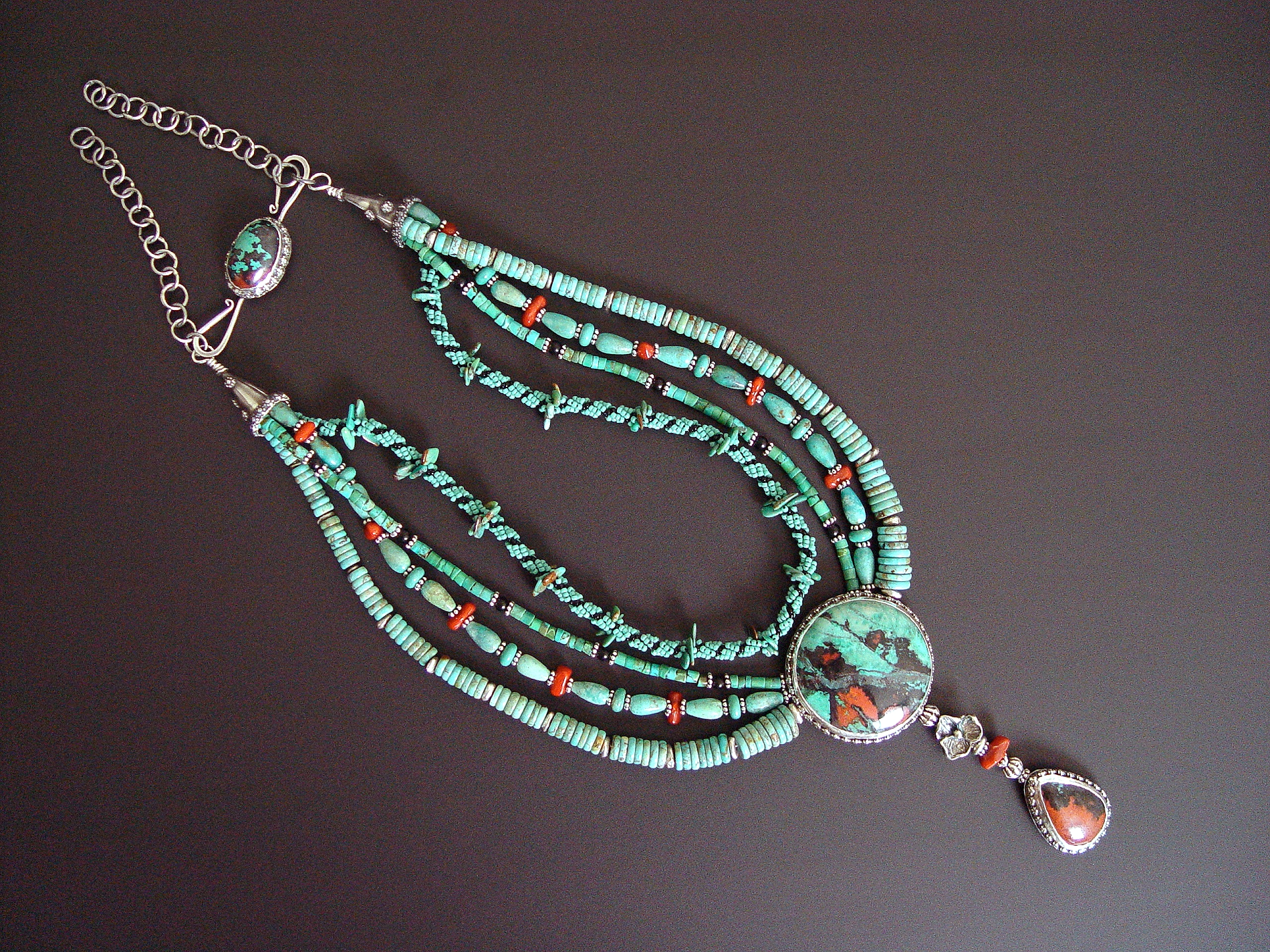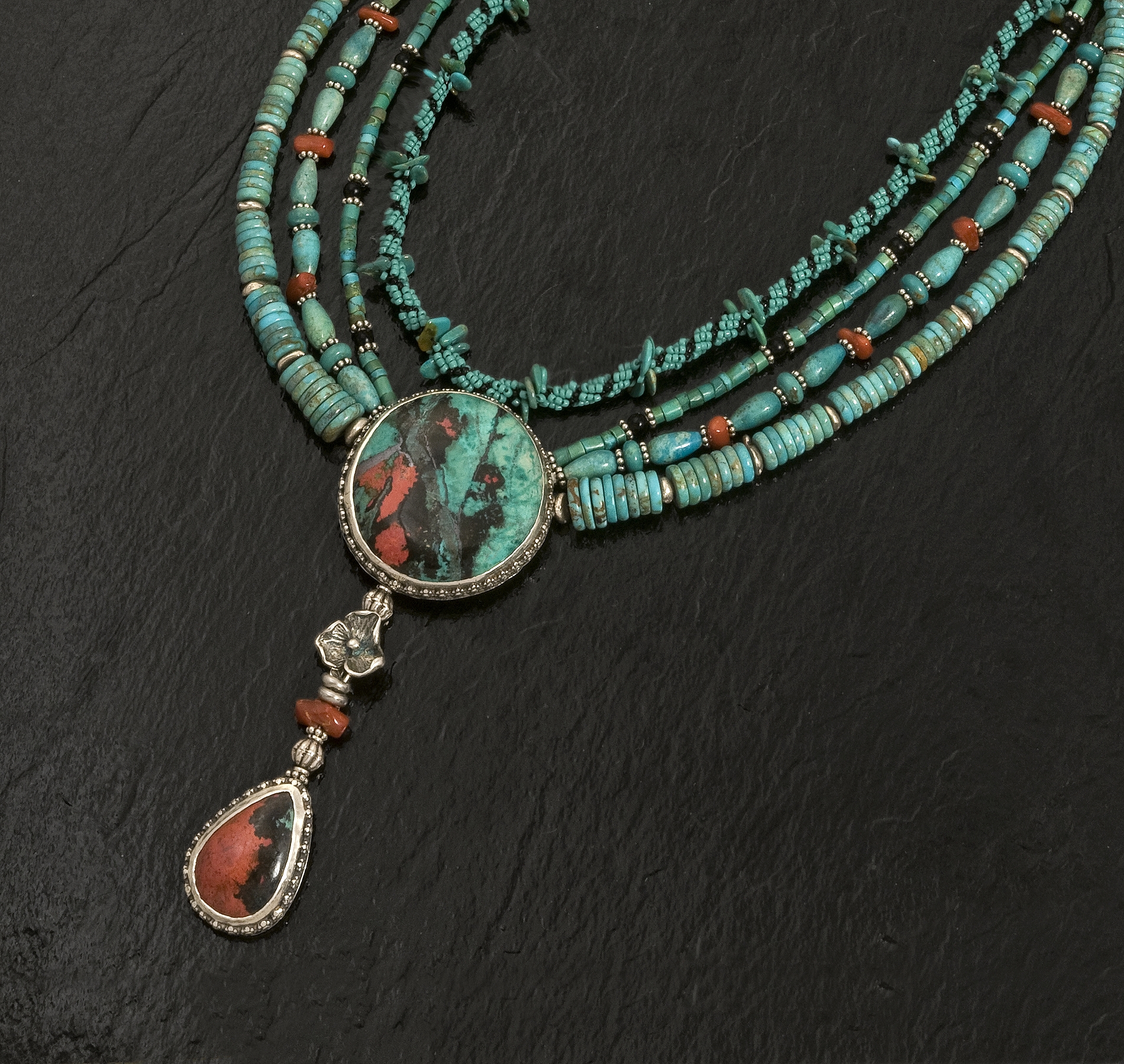 "Sonora Sunrise" is a natural admixture of chrysocolla and cuprite. The turquoise in the necklace matches the color of the chrysocolla perfectly. The centerpiece has an amazingly romantic image of a masked man holding a rose in his gauntleted hand. The dangling pendant is removable so the necklace can be worn with the round centerpiece alone. The turquoise strands are strung on cable for strength.