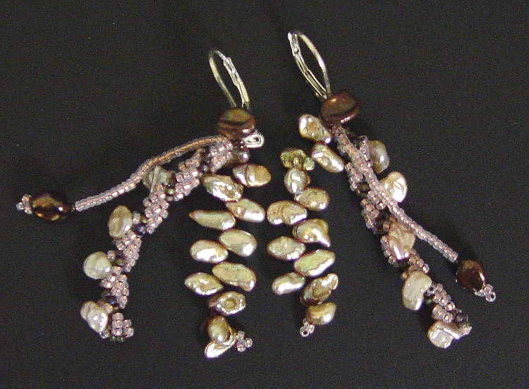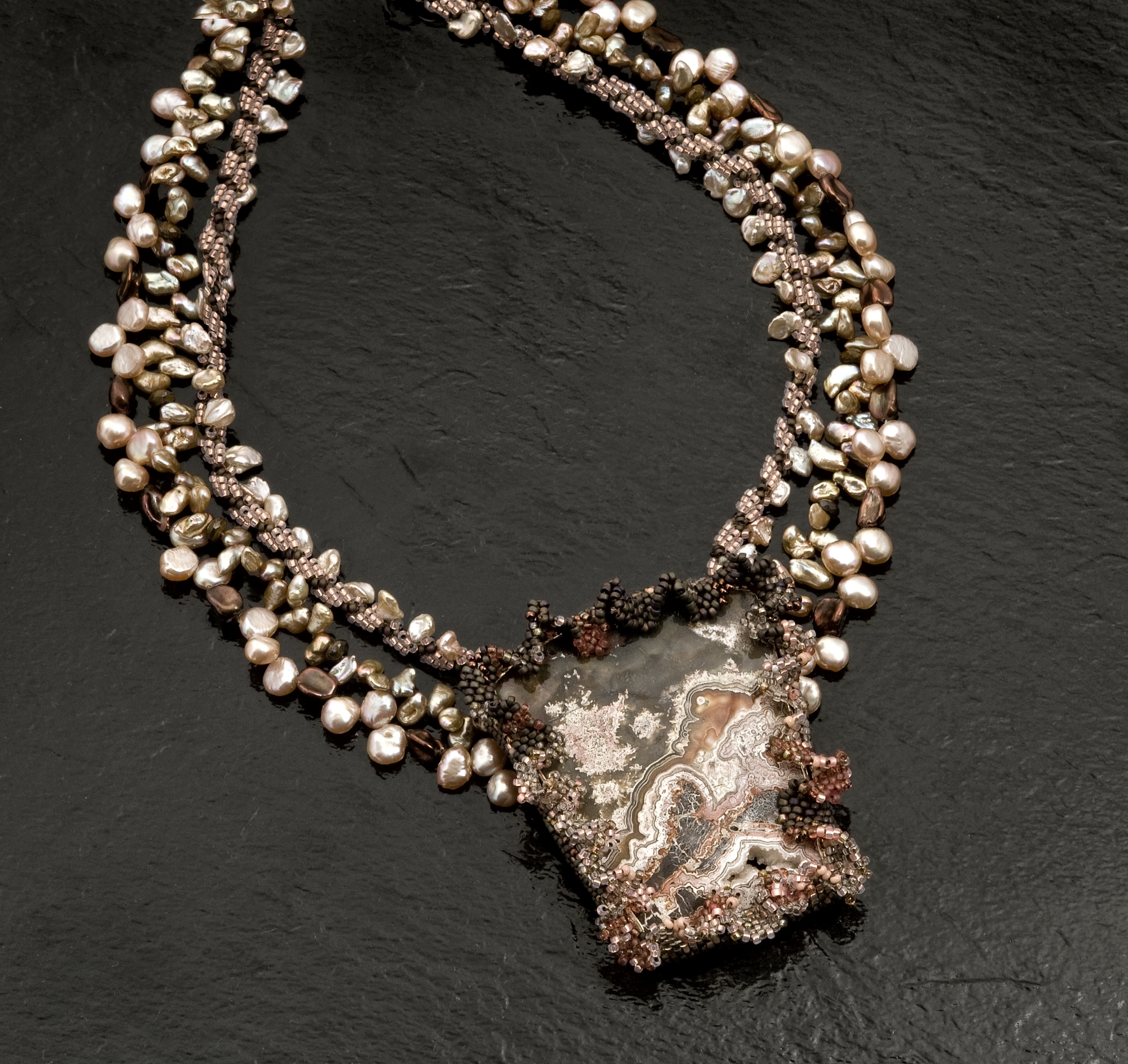 This gorgeous stone is set in sterling (really--check out the photo of the back). Zenz' Agates II indicates that recently very little Crazy Lace Agate, mined in Chihuahua, is coming onto the market. I certainly hope the deposits have not been exhausted! Crazy Lace is named after the lace-like patterns which develop in the stone. The lovely pinks and browns are due to secondary iron oxides in the microcrystalline quartz. This one has a beautiful little drusy pocket at the lower right, contributing a coral reef to the ocean wave image I seem to see in the stone. I softened the form with a ruffle of seed beads, and added strands of pearls and more beadwork to complete the composition.