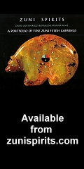 This diminutive medicine bear is carved in Stewart Quandelacy's signature style (note his bear on the cover of McManis' definitive Zuni Fetishes and Carvings below). The slightly dated but fascinating book The Fetish Carvers of Zuni shows an earlier Stewart bear with a straight heartline, but the ones I have seen more recently are beautifully elaborated like this one. David and Darlene Riggs have produced a gorgeous book of Zuni carvings (Zuni Spirits, see below) which has two of Stewart's broad-shouldered bears. One has the heartline on the right, as does the one on the McManis cover, the other, like this sweet purple bear has it on the left. The heartline is also called "spirit line" and "breath line" and according to Bahti, there is no word for it in the Zuni language. I discussed the mythology of the heartline at some length in relation to another Stewart bear here, quoting Cushing's 1881 Zuni Fetiches. Cushing wandered in to Zuni as a young man working for the Smithsonian Institution, was welcomed by the people and wrote extensively about the Zuni.