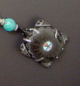 Sgraffito means "scratched." Normally the term is applied to designs scratched into a painted or ceramic surface to reveal different color layers. Here the artist has taken advantage of marble's chalky white appearance when scratched to make a delightful turtle shell pattern radiating from a sunface. The design contrasts beautifully with the highly polished surface. So... have the Zuni adapted an old Italian art form? Perhaps, but we also need to recall that Native Americans have been scratching designs and information in rock since they arrived here -- isn't that the definition of a petroglyph?