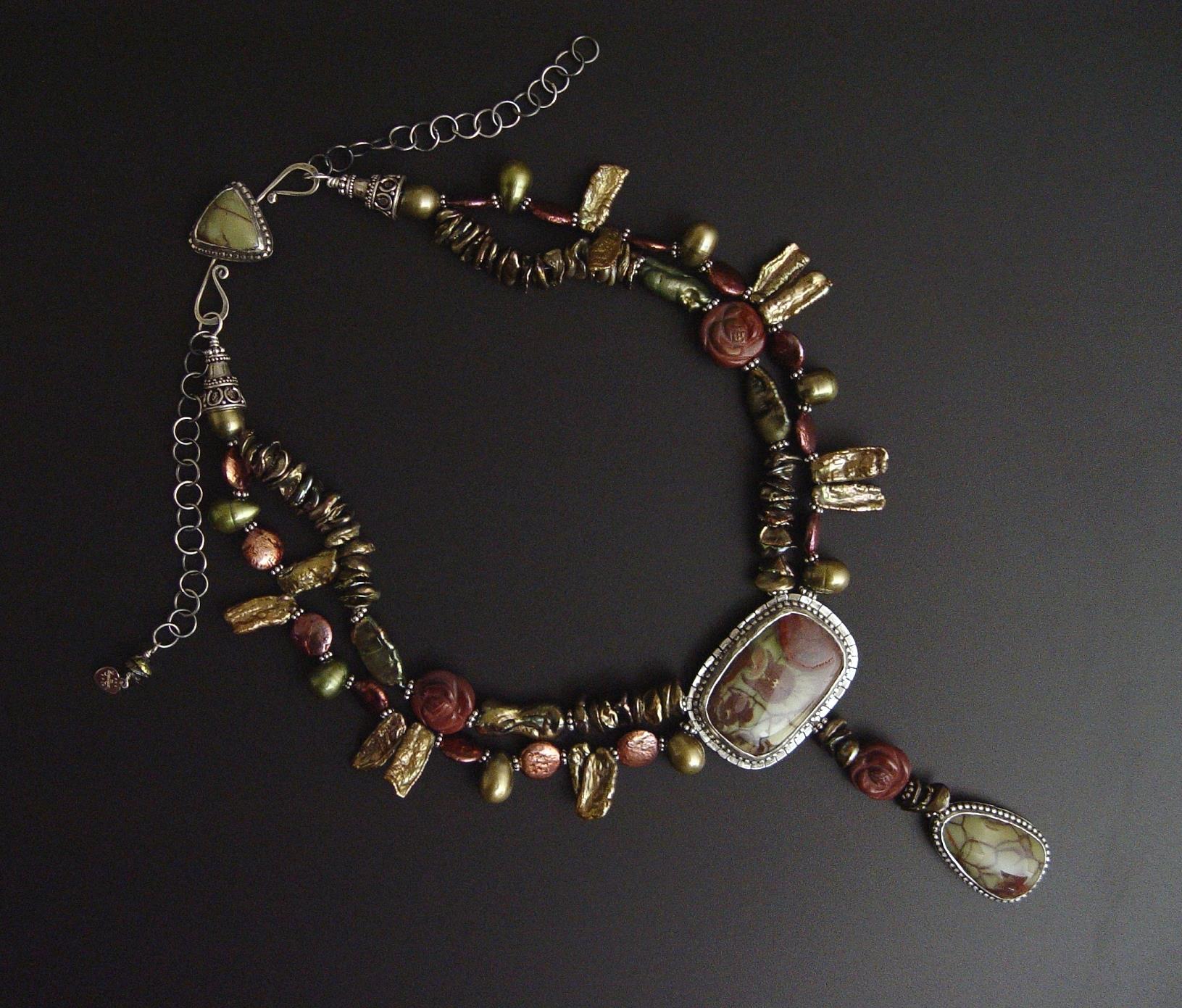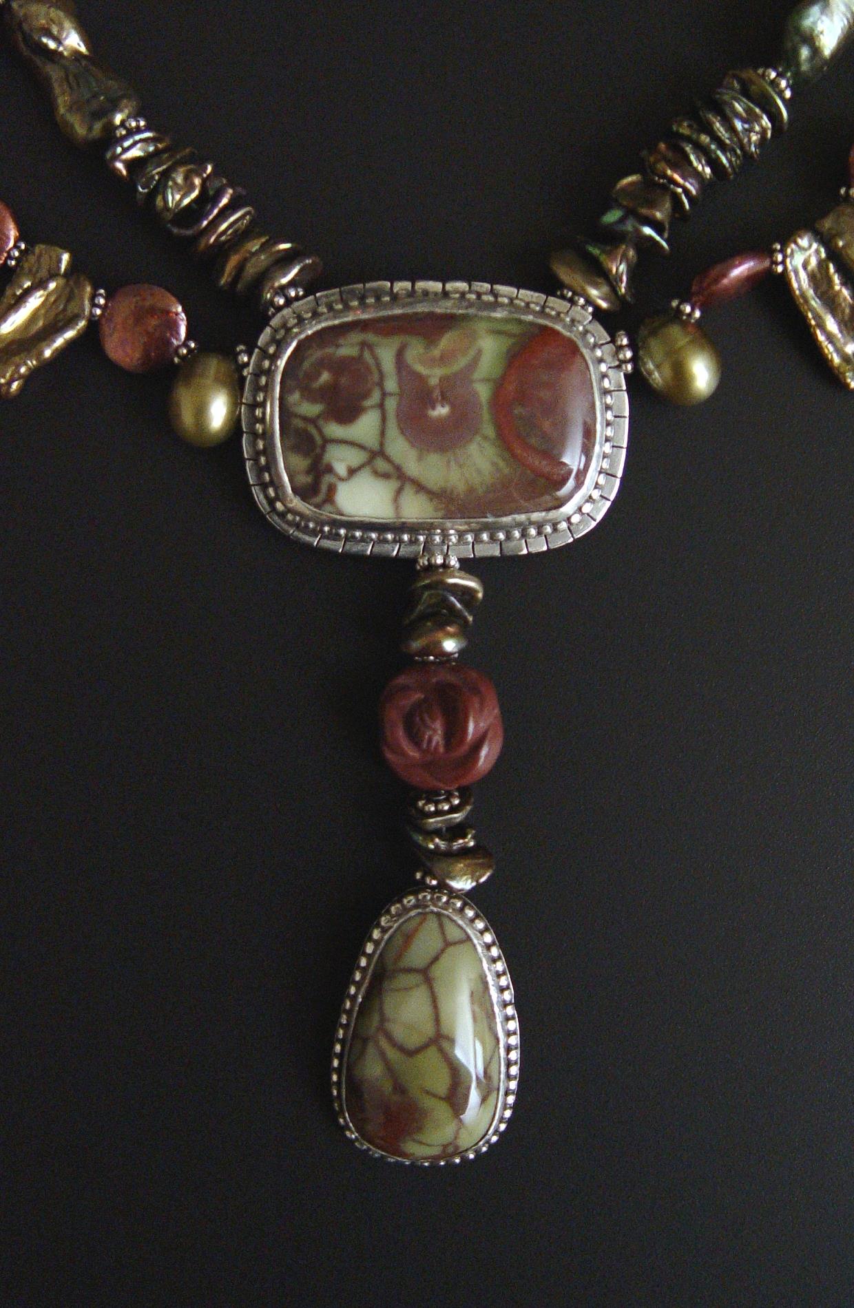 The webs in these stones are most evident in the pendant, clasp and earrings. The centerpiece is dominated by the cat and a big red rose, so I put more jasper roses in the composition with pearls. I hope you will enjoy the luscious colors which are neutral enough to go with many outfits.