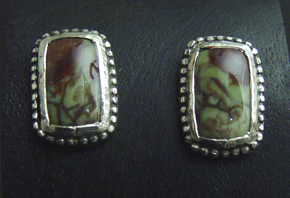 Gary Wilson cut this suite of spider web jasper with the image of the Cheshire Cat in the centerpiece. It was surprising to see it called "spider web" because I have a lot of black material with fine red lines that I thought was "spider web" so what's going on? I found a discussion of this olive/red material, apparently discovered on the Oregon/Idaho border in the early '60s by Phil Pegra's dad. The commentator claims it is called Pegratite though neither Dr. Pough nor Mr. Google seem to have heard of that name. Apparently the stones in this necklace are the traditional spider web. My black/red material (which I may make up someday) is called "Spiderman Jasper." So there you have it!