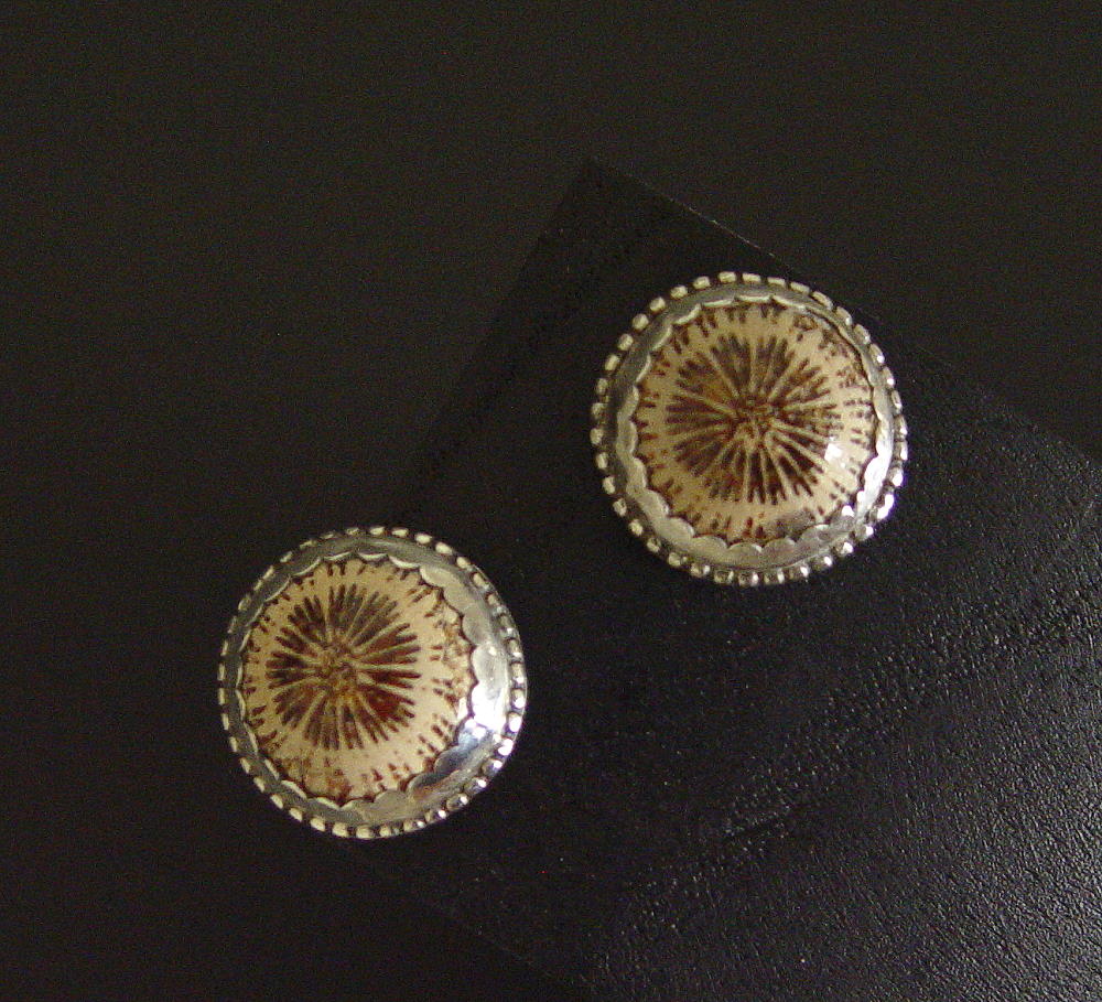 People have asked me how I painted these lovely designs but of course they occur naturally. I failed to ask if this is fossil material though I assume it is. One can find images of similar designs in agatized single polyps from Indonesia on the web. The high-domed stones make very attractive, neutral earrings.