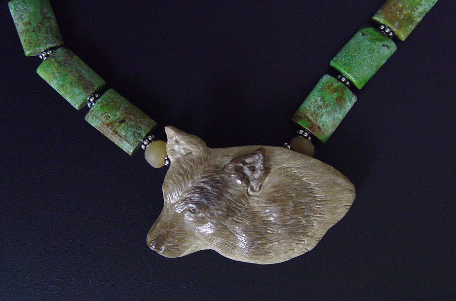 A simple setting for an exquisitely carved wolf. Bas relief carving is a remarkable art. This wolf was carved from a very thin piece of fossil ivory and yet appears three dimensional.