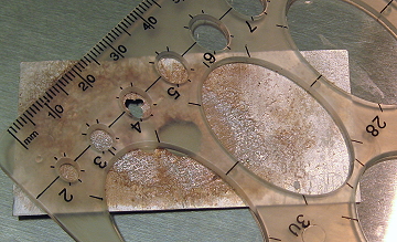 ![]() Photo 6 I covered the footprints with a resist so in theory solder won't flow onto the tops when I silver the backs then solder them onto the amulet. |