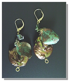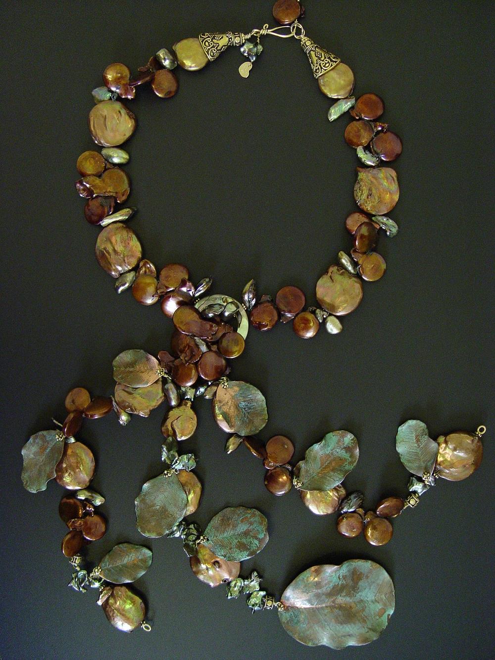 A wild collection of giant coin pearls and copper-coated natural leaves.