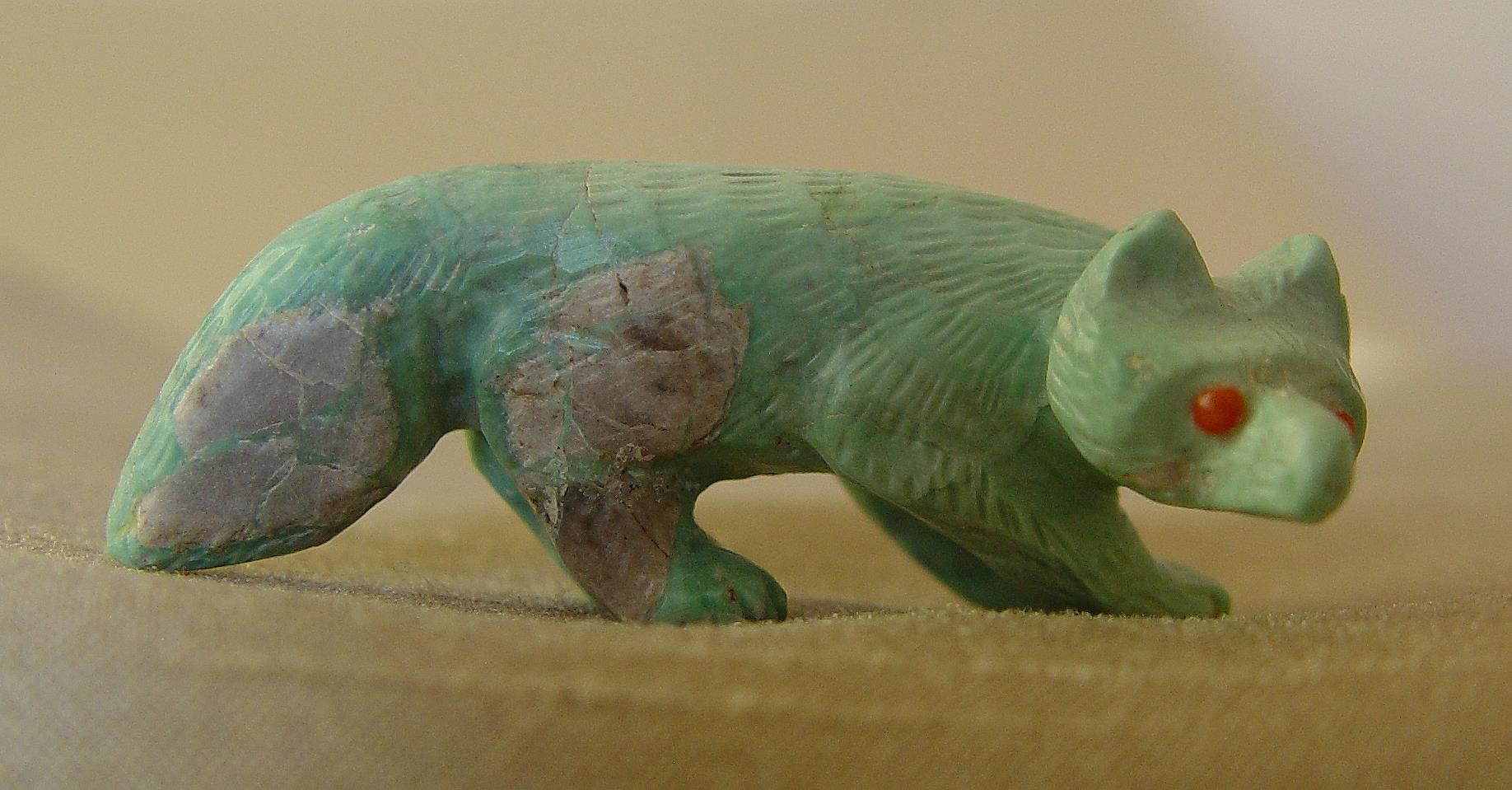 We know the beautiful animal in this necklace is a wolf because a) the carver said so; b) it looks like a wolf; and c) it has the traditional long, full hanging tail characteristic of the Zuni style of representing wolf. The Cheama brothers pioneered the realistic style of carving exemplified by this little wolf. The Zuni use wolf fetishes for success in hunting larger prey. Dennis and Barbara Tedlock (see below) record the story told by Marius Barbeau of the medicine man Isaac Tens, a member of the Zuni Wolf Clan. They tell stories of ceremonies in which the wolf is summoned from the east. They watched as offerings from a deer which had been killed were made to the "raw persons": mountain lion, coyote, bobcat and wolf.
