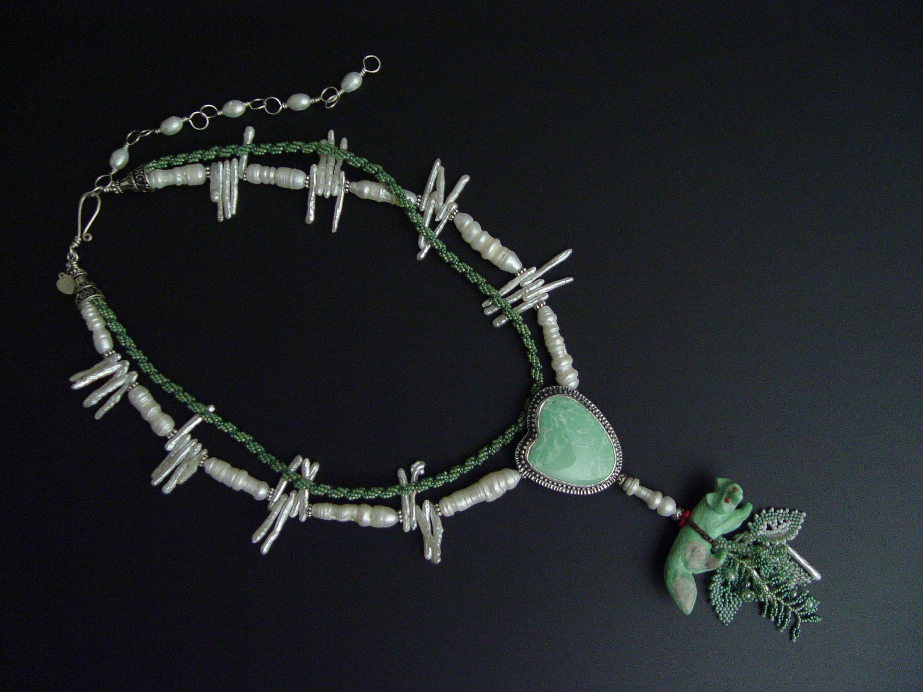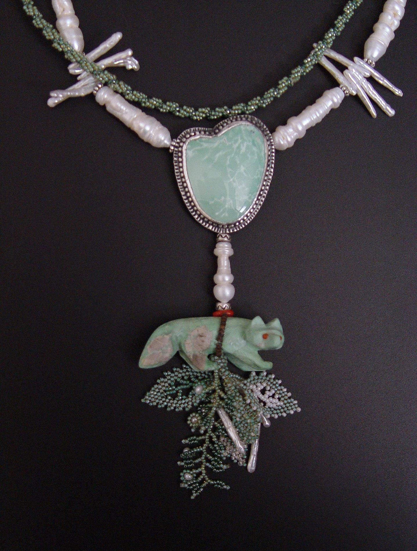 Wolf Woman's Set includes a variscite wolf by the Zuni carver Wilfred Cheama, pearls and variscite cabochons. Anyone who has read my articles knows I am passionate about the natural environment and extremely critical of our ruthless depredations. As a trained biologist who did graduate work in systems ecology many years ago, I have come to appreciate some tiny bit of the incredible intricacy of the web of life. We ignore this intricacy at our peril. Dead set against this world view is the world view of many ranchers who want to feed and clothe us by grazing non-native species on vast tracks of our precious public and private lands and who suffer economic hardship due to the depredations of top carnivores like the wolf. Ranching is an incredibly difficult activity, fraught with dangers and economic hardship, one can certainly understand why ranchers are concerned. There may be more to it... Biblically the wolf is depicted as a fierce and dangerous animal, although curiously there are no stories in the Bible of actual wolf attacks, as we have for example for the lion which took David's lamb. The Druid Animal Oracle includes the shadow as one of wolf's attributes. Do these metaphors for evil lurking in the dark reside deep in our unconscious and somehow allow people to justify gunning down exhausted wolves after pursuing them on snowmobiles and from helicopters? I submit that while the metaphor is useful for self examination, it has nothing to do with the actual animal. When we project our fears outward, does it ever solve our problem?