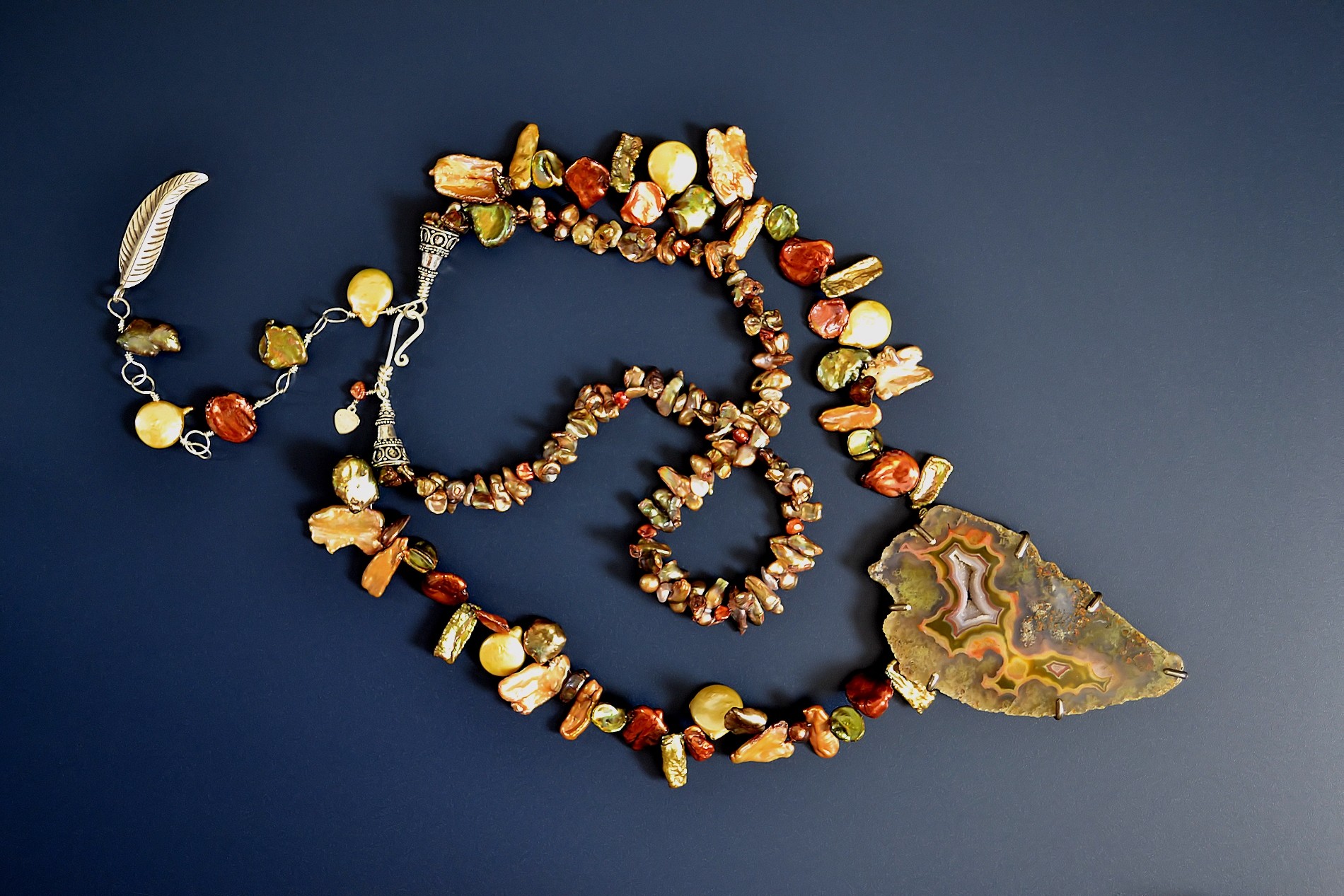 Zenz mentions Agua Nueva in each of his 3 volumes. He shows a photo of mining at Rancho Agua Nueva in Agates II and he profiles Thom in Agates III. Rancho Agua Nueva borders the Coyomito Ranch and is north of the Laguna deposits in the Mexican state of Chihuahua. Agua Nueva is famous for its pink agates, so this one is unusual in its fantastic autumn leaf colors as well. A wild variety of freshwater pearls completes the composition. Please order this one-of-a-kind composition today.