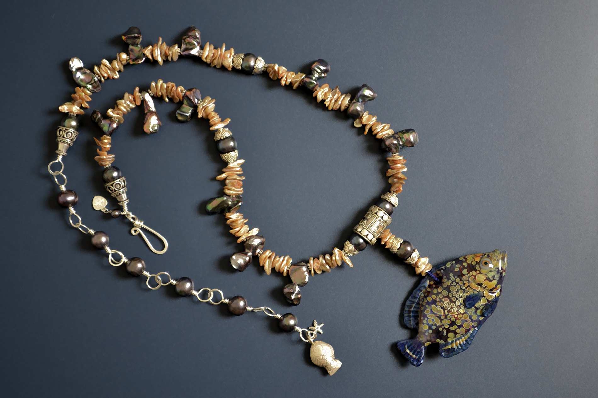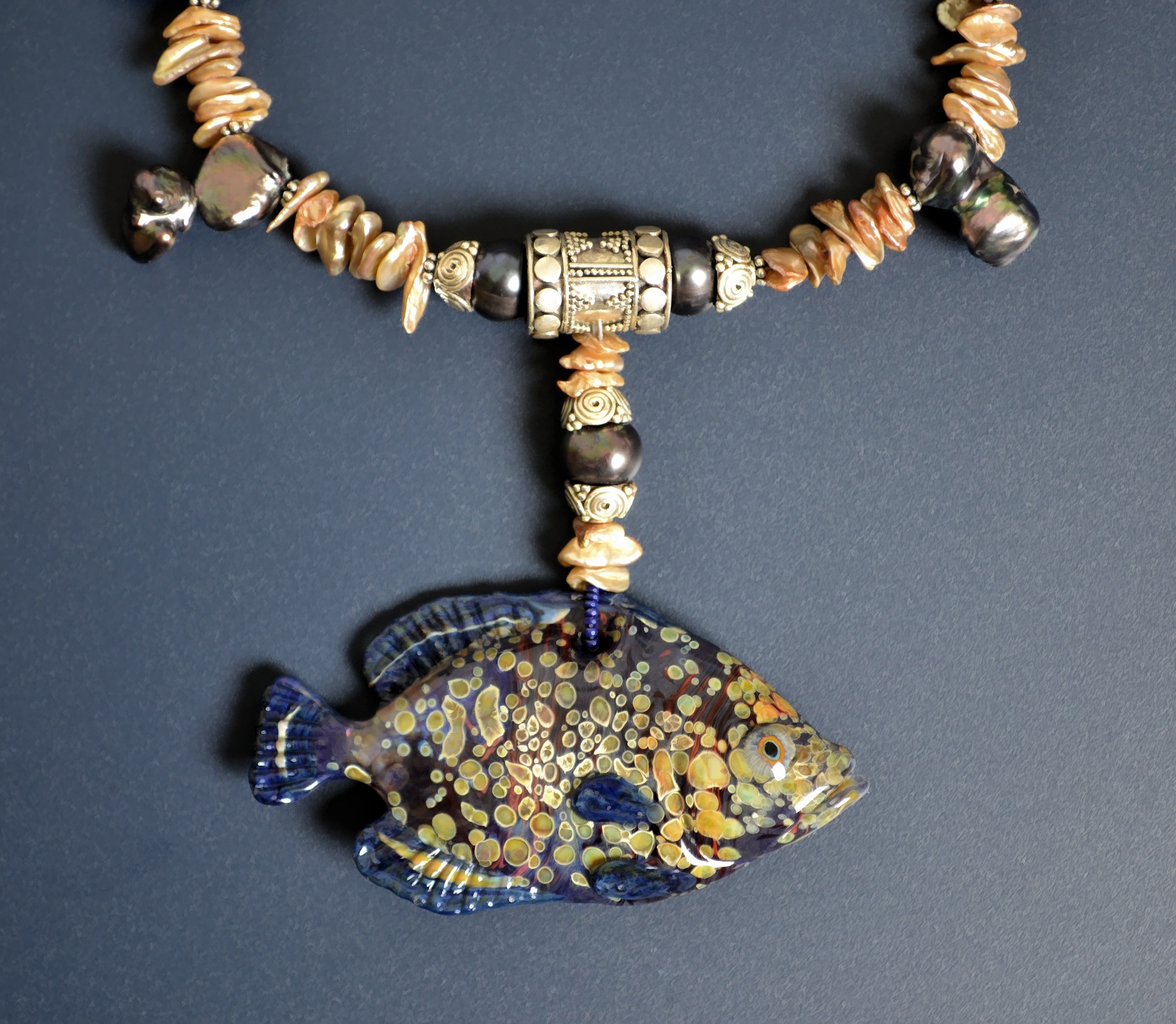 Inquiring minds need to know what type of fish this is! Whereas I could have asked the glass artist, did I? No. Blue rockfish perhaps? No, the anal fin is all wrong. I checked out some saltwater fish guides then thought this guy resembled the cichlid I had a zillion years ago. Some cichlids like the convict cichlid have dorsal and anal fins shaped like this but cichlids tend to have larger caudal fins than our little guy does. Perhaps someone will help us out with the identification? In any case, he is a beautifully detailed specimen with perfect eyes and mouth, lovely dappled colors, and very attractive shape. He can be worn swimming either way. Won't you give him a home?