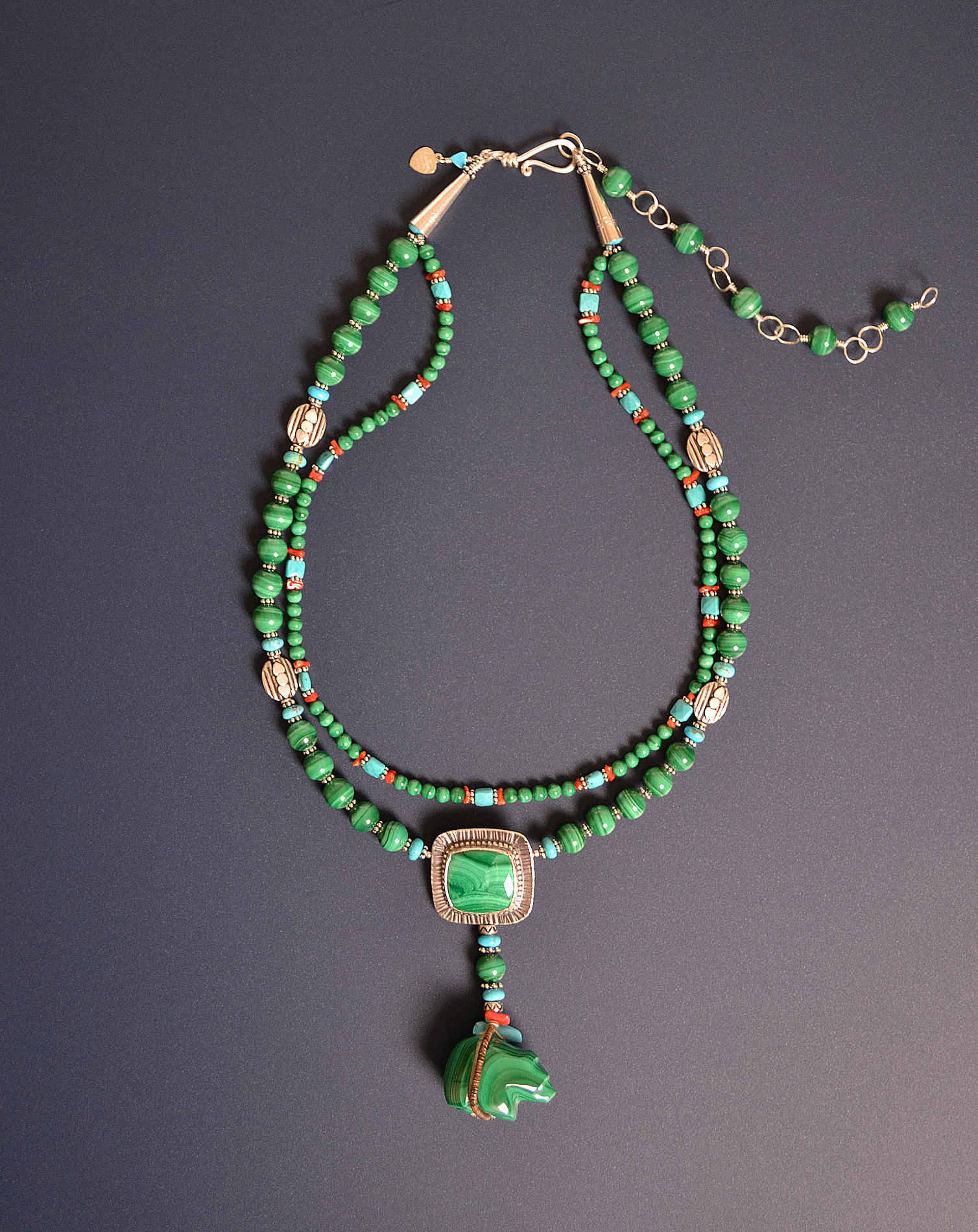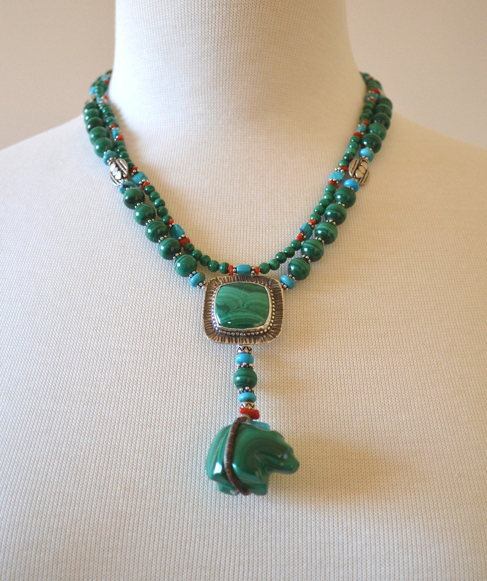 I find Malachite a difficult stone to design with because it is so strong. It seems like a little bit goes a long way, and it's challenging to find other stones which get along with it. Here I solved the problem by using small beads with bright spots of equally strong color. To find matching stones, I carried the bear to Tucson and sorted through large piles of Malachite cabs.