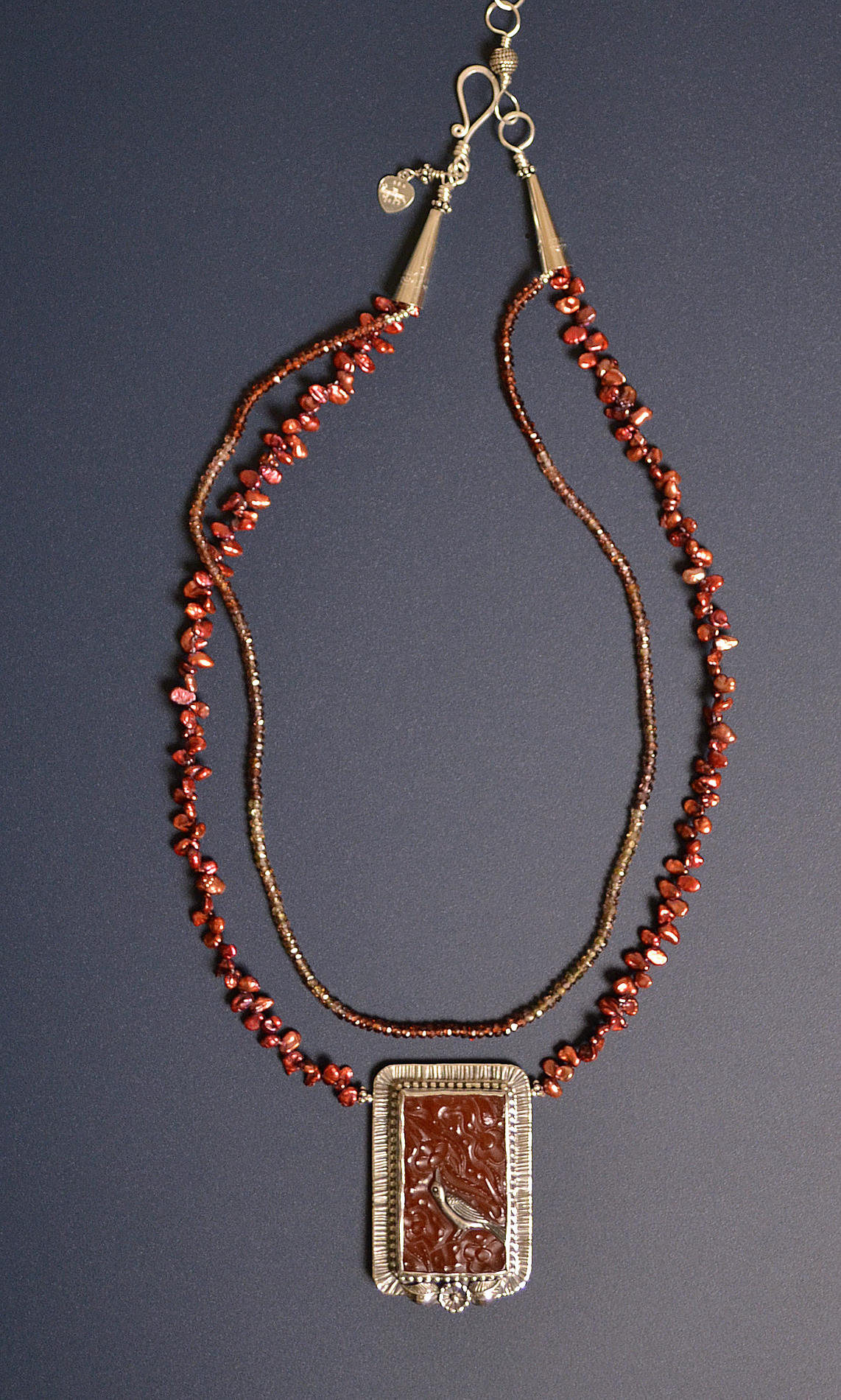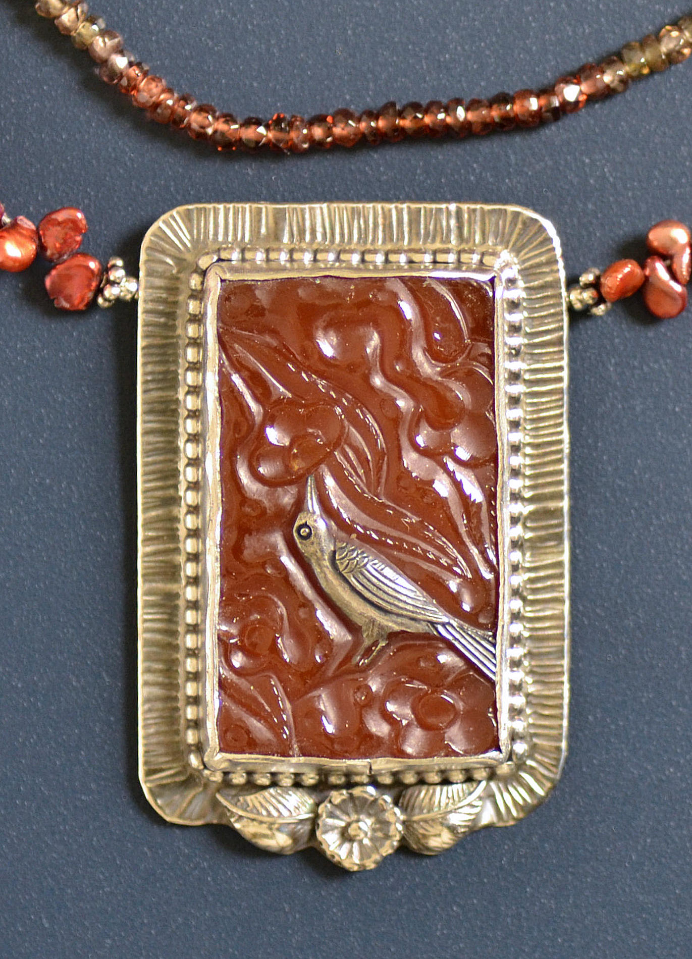 I questioned my sanity when I decided to set a glass cabochon in silver with sapphires and pearls. Glass cabochons have always been used in "costume jewelry," often very attractive, but set in base metal and mass produced to keep the design inexpensive. Miriam Haskell's extraordinary body of work illustrates that humble glass, lovingly set in hand-made designs with excellent workmanship, can be beautiful, glamorous, and now highly collectible. Although "glamorous" is not a term anyone would use to describe my work ("the glamorous wart hog tusk necklace..." just won't fly), I hope you find it attractive, even beautiful, and always unique and interesting.