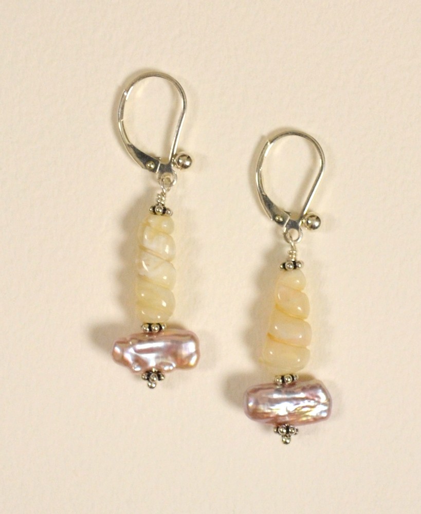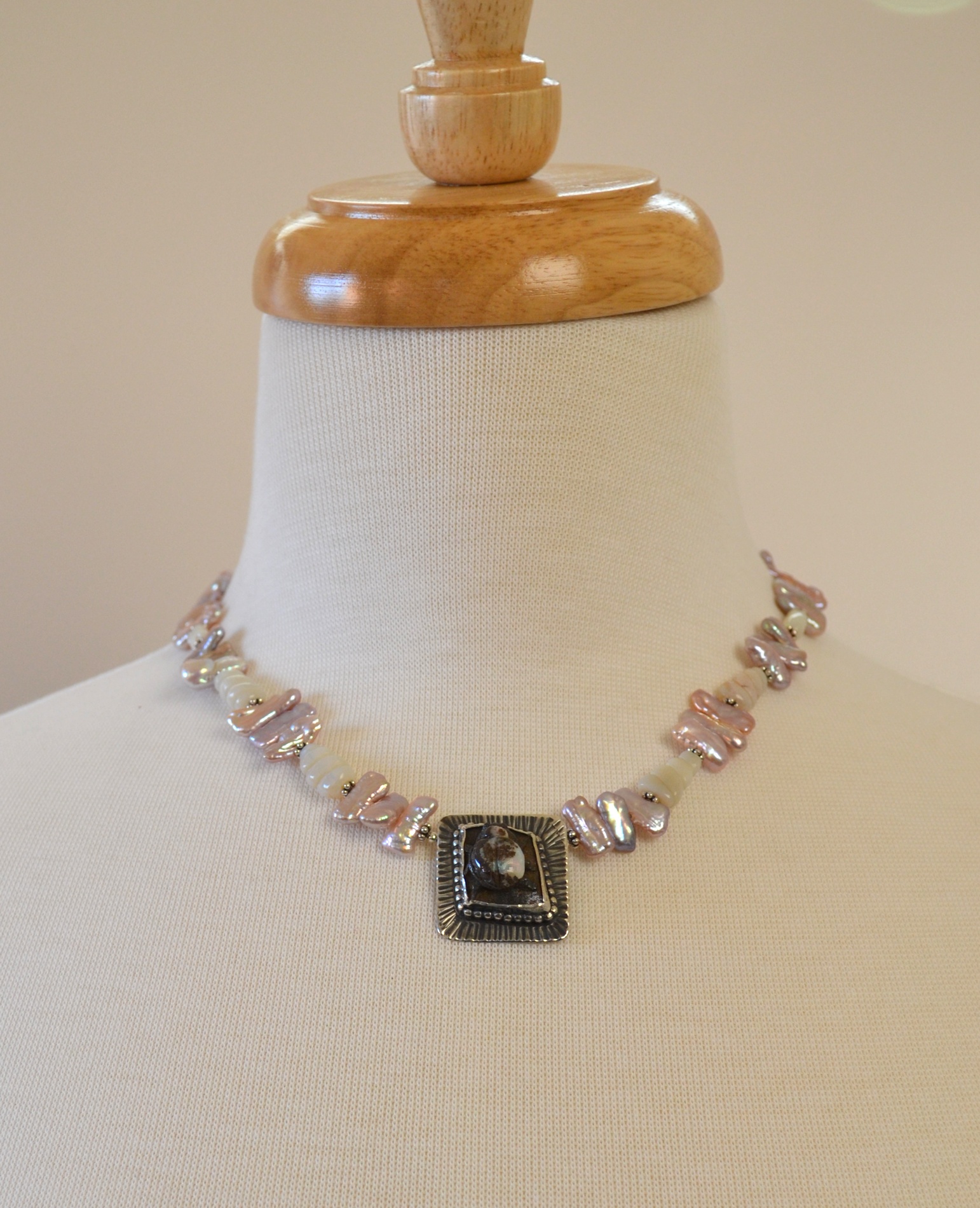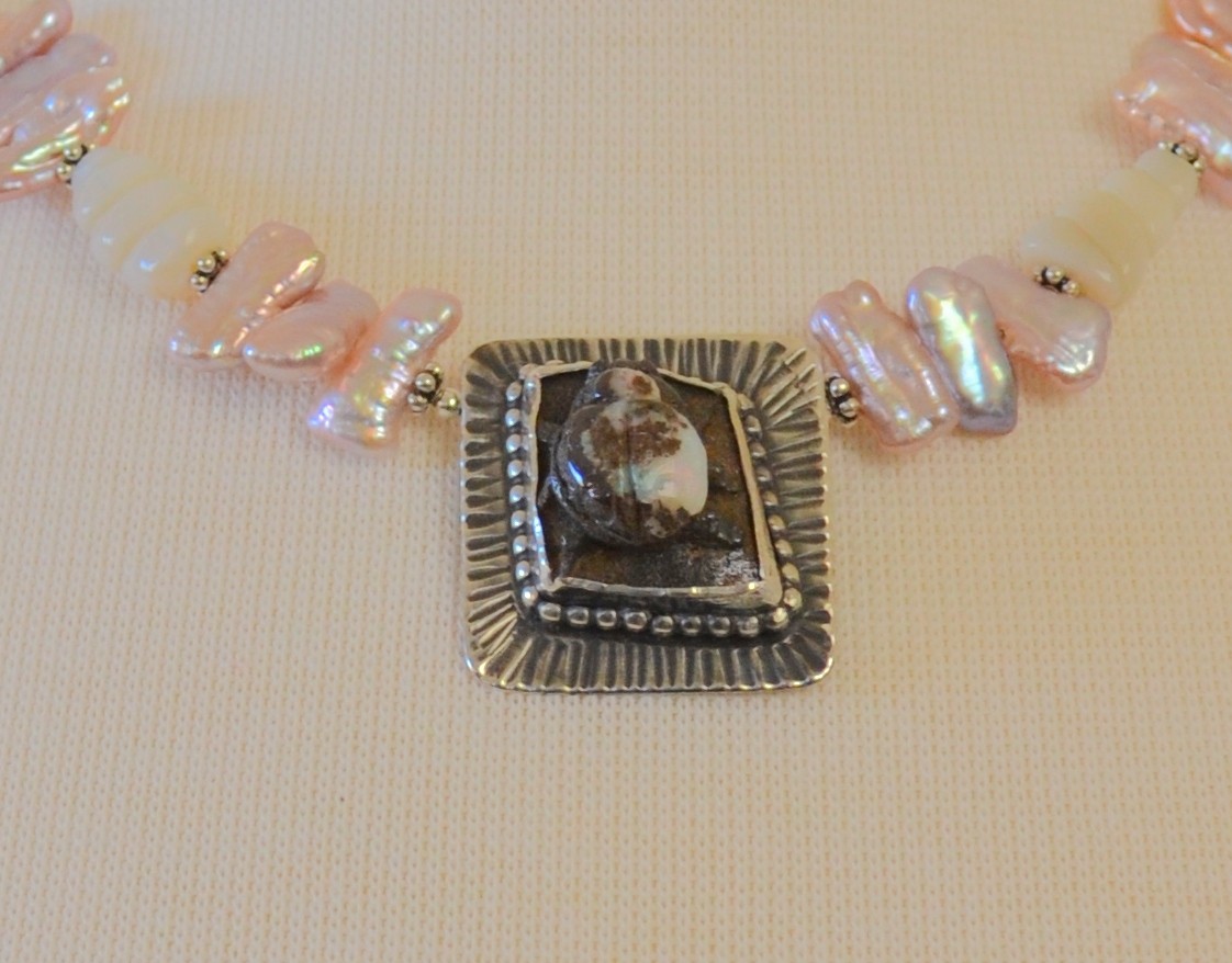 To complete the discussion of the components, please note that the spiral beads and tubes are hand-carved Australian opal. Freshwater pearls complete the composition.