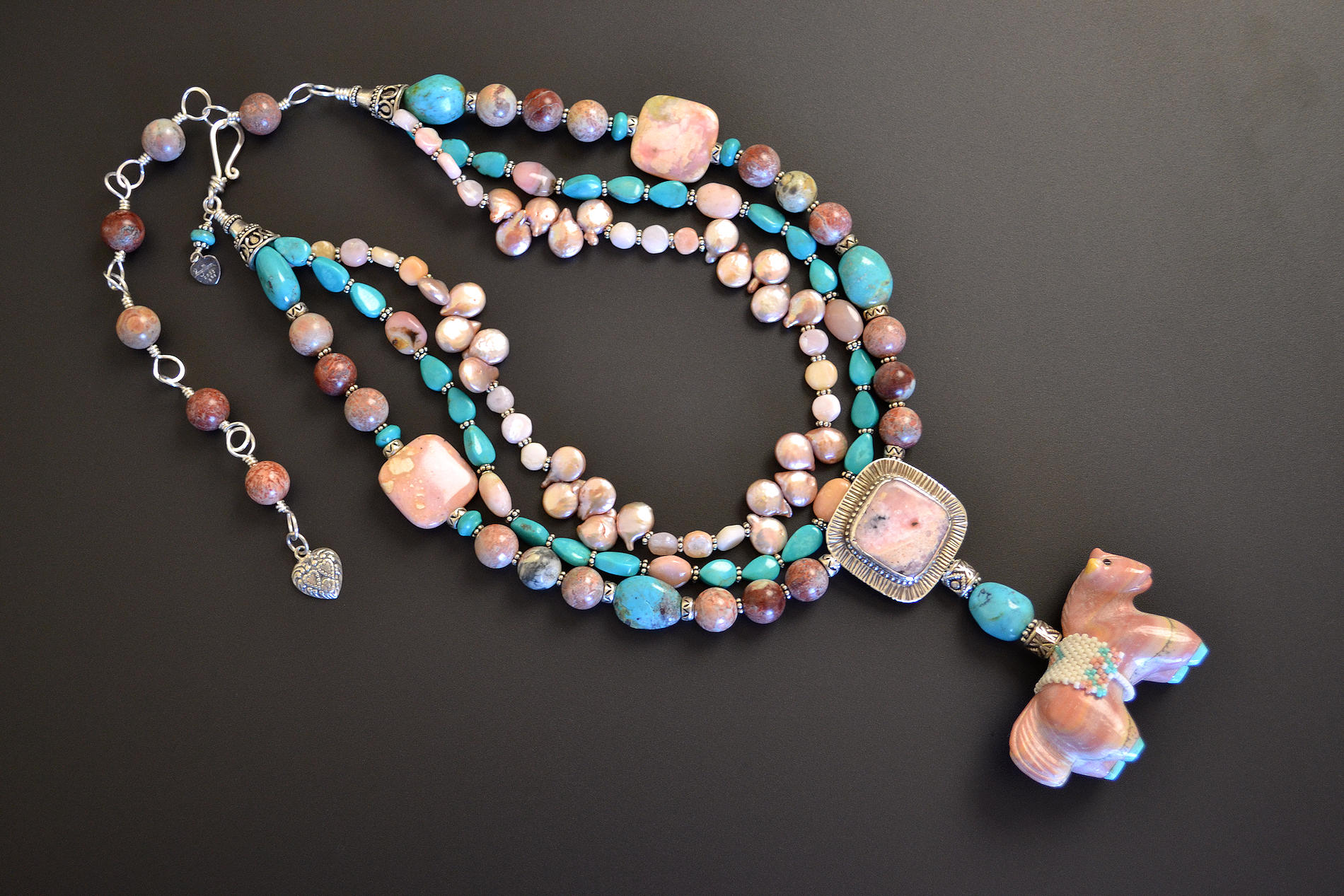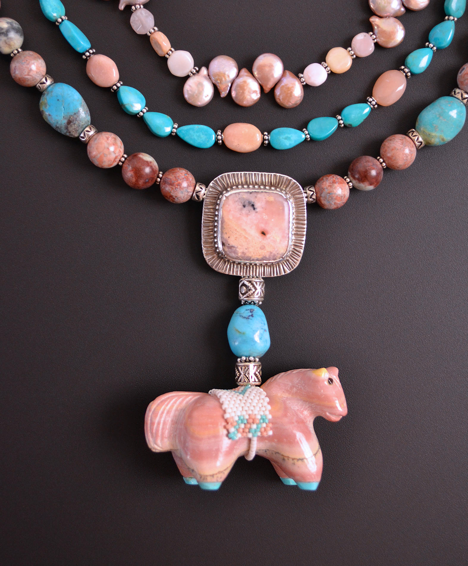 Penny is a special order to commemorate a beloved pony. Hayes Leekya's ponies are unique and lovable. I fell in love with this pink girl with her turquoise toes! Turquoise, flower jasper, pink opal and pearls complete the composition.