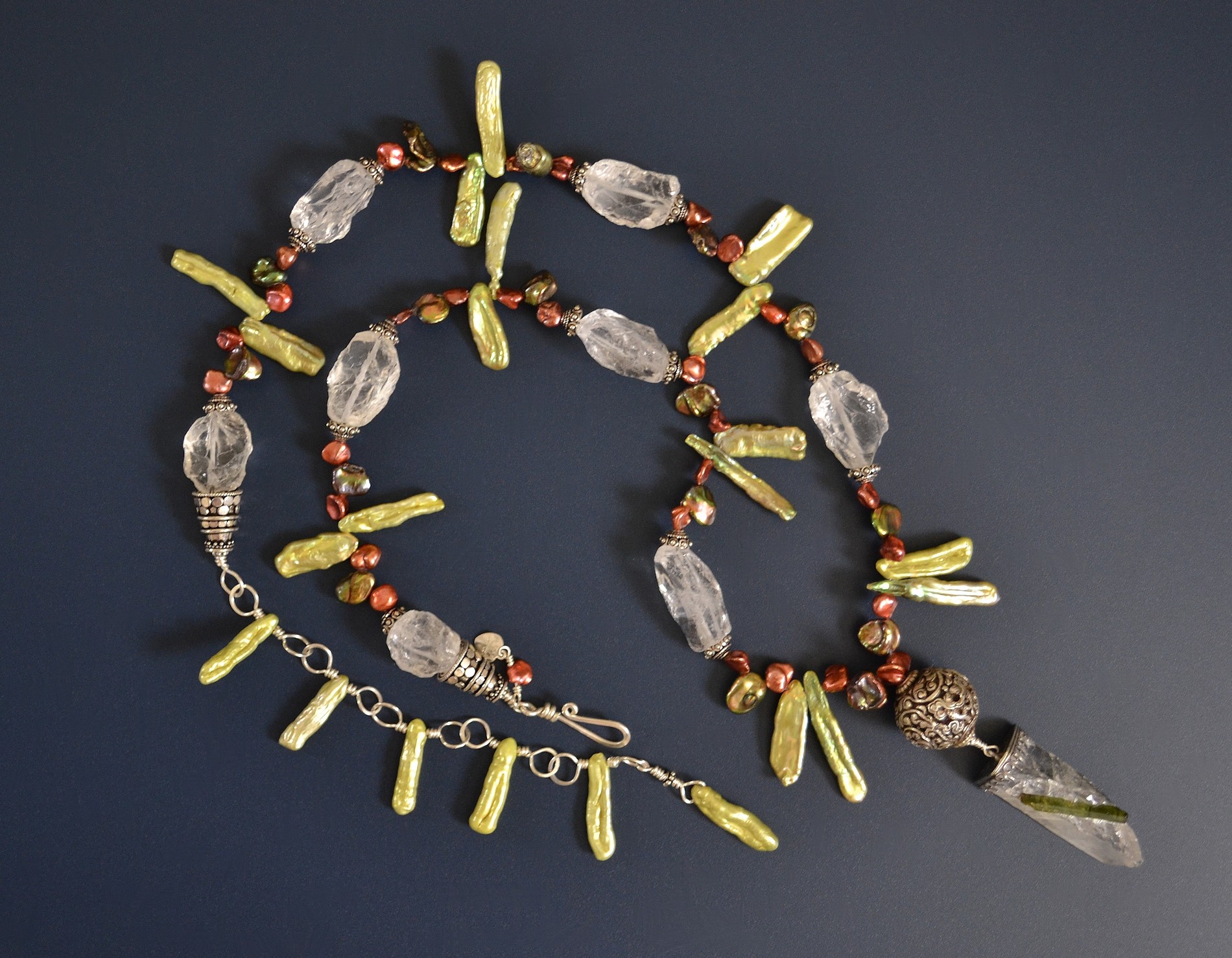 Here's a fascinating quartz crystal with a green tourmaline growing in it. It seemed to me it would make a nice necklace, especially with some hand-hammered quartz beads and wild pearls. The gorgeous sterling bead just above the crystal adds interest. Note the detailed photo of the crystal alone was lit from behind on a light table. It's a four-season piece: icy crystals for winter and to cool a hot summer day, spring green pearls for spring and autumn colored pearls for fall. What could be more versatile? I hope you will order it today!