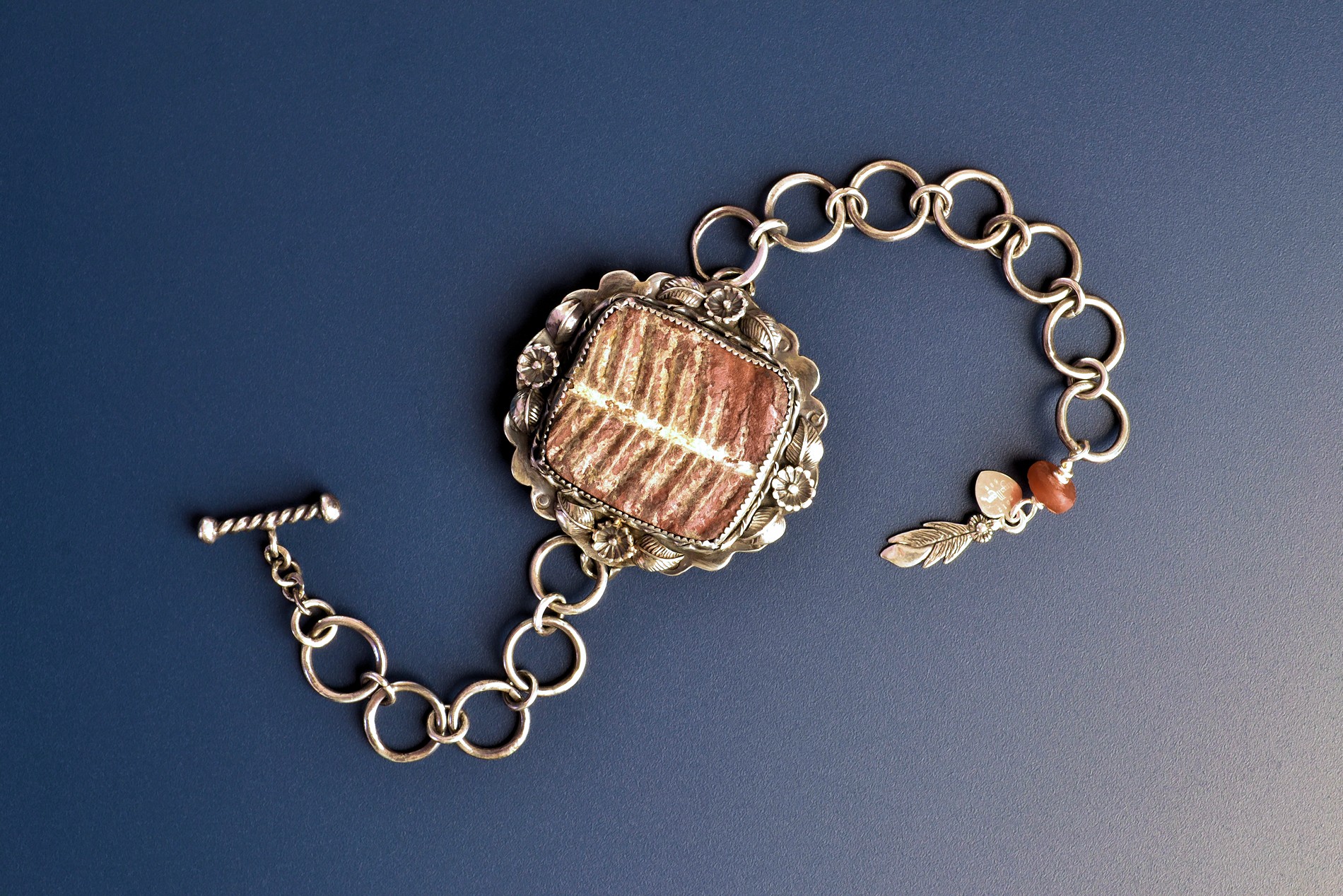 This sterling bracelet features a handsome, rough-surfaced chunk of fossil fern. The hand-made chain makes it adjustable and easy to wear.
