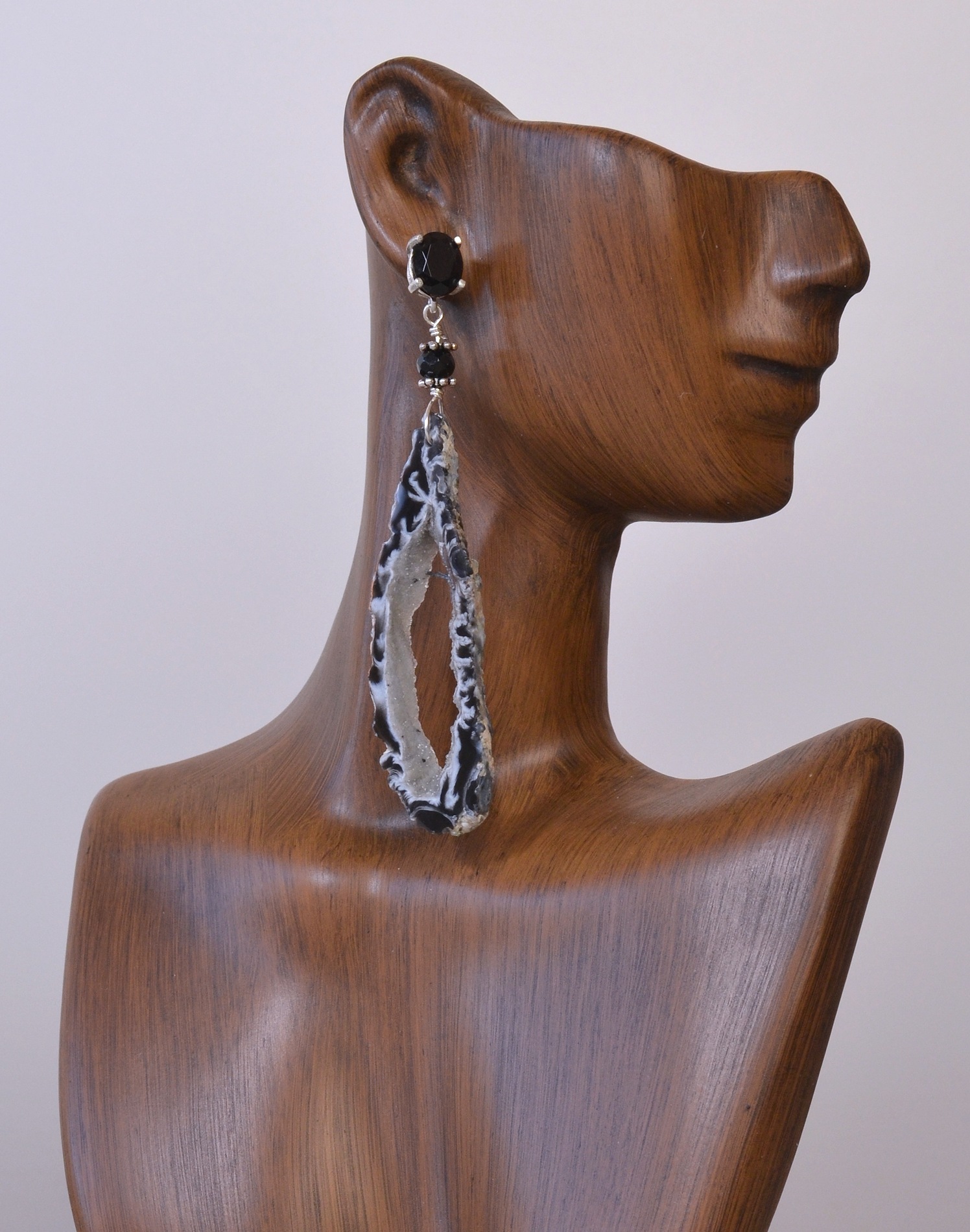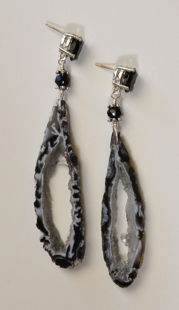 These dramatic earrings are "fraternal twins," slightly different because they are natural shapes cut from the same black and white agate geode. "Oco" means "hollow" in Portuguese. The inside of the geodes, like most hollow ocos, are filled with tiny clear drusy quartz crystals, including one lovely larger crystal in the right-hand earring. The wavy black, white and grey patterns are typical but thus far unexplained scientifically. Cross and Zeitner (see below) show interesting photos of the area where these beautiful stones are found, also of piles of the uncut stones. They discuss them in some detail. Their book is a wonderful resource for anyone interested in geodes.