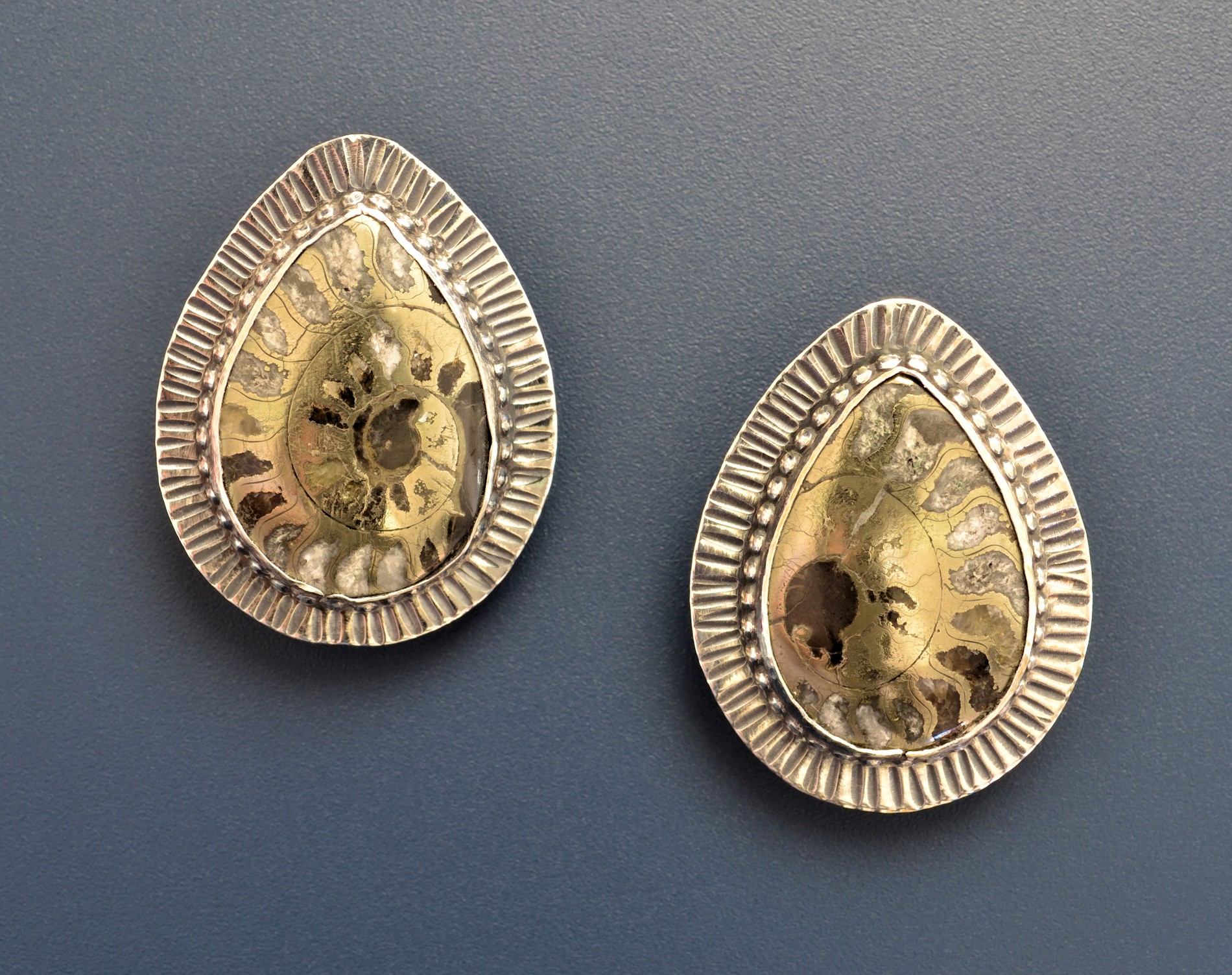 From the photo, it appears there are deep openings in these stones between the sutures. Ha! Not so. In fact the stones are domed and completely smooth. The impression of depth arises from the different colors of pyrite in the fossils. Note too that pyrite, also known as "fool's gold," is a slightly more silvery grey color than is apparent from the photo. Gary sliced a single ammonite longitudinally to obtain the mirror image patterns for these earrings. This specimen likely came from the Volga River area in Russia.