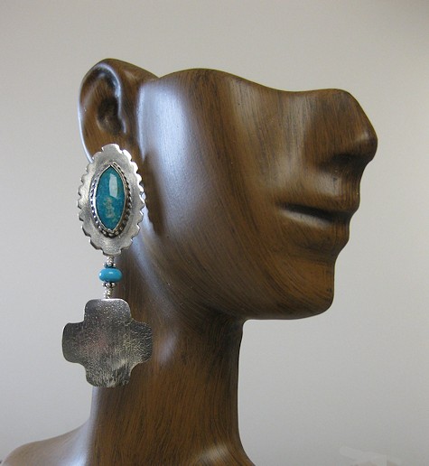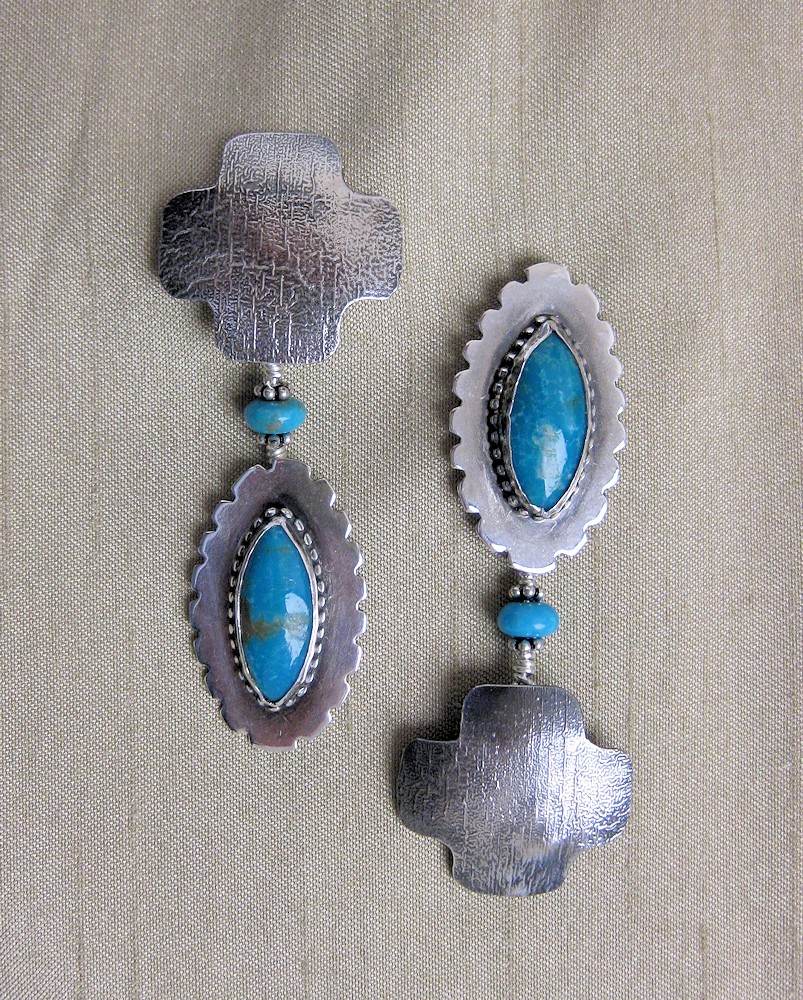 These earrings were a special order. The customer wanted earrings for her sister and daughter which were similar but distinct. She wanted the reticulated silver four winds cross with dangles and wanted different color and shape stones in each pair. The other pair is shown here. Perhaps you would also like to work with me on a special order?