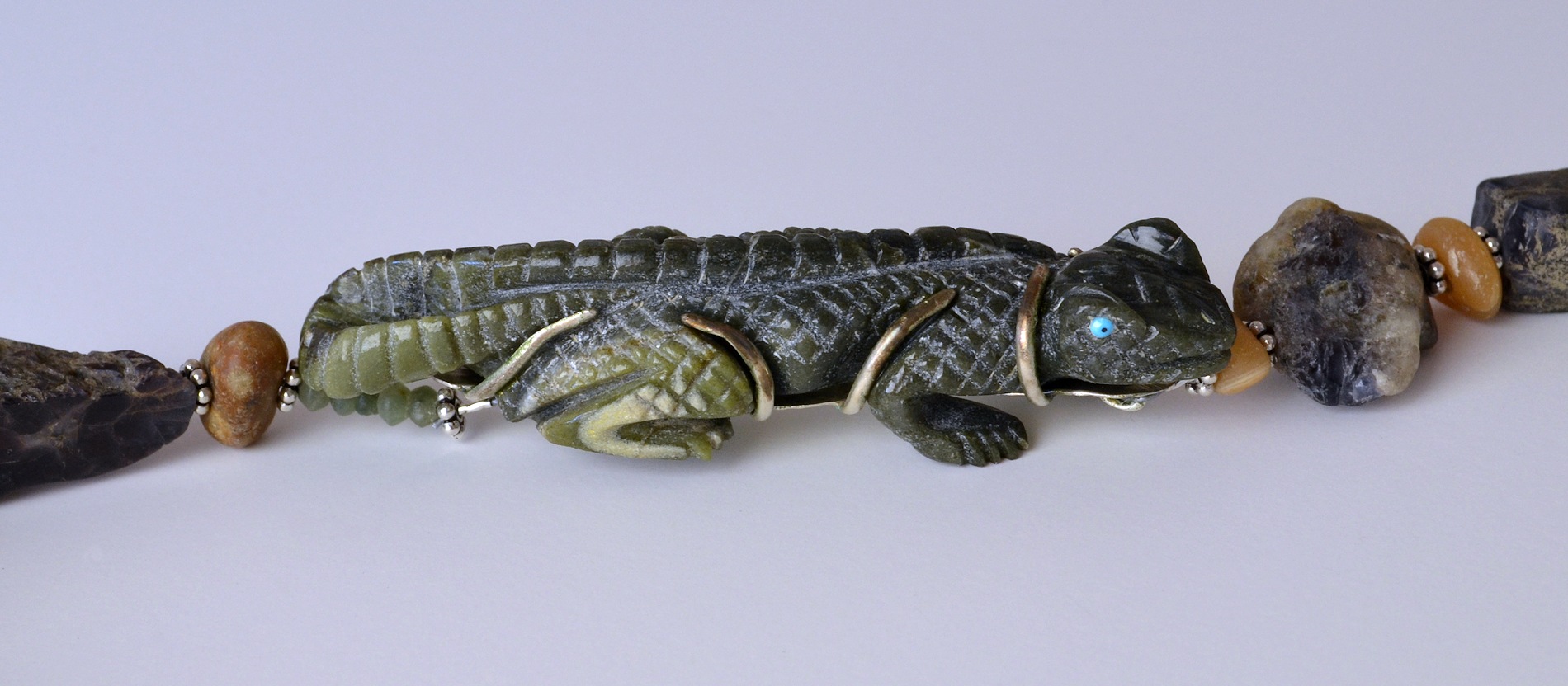 Karen Ovington makes the most unusual and amazing beads which blend perfectly with natural stones. People have mistaken them for ceramic beads, rhyolite beads, etc., but no, they are handmade glass. A little golden jade brings some color to the composition. The result is a casual, attractive and fascinating necklace in which each element has a story. Some would prefer a diamond necklace with stones cut by a robot, settings with stones cast in place, made by a machine, untouched by human hands. Would you?
