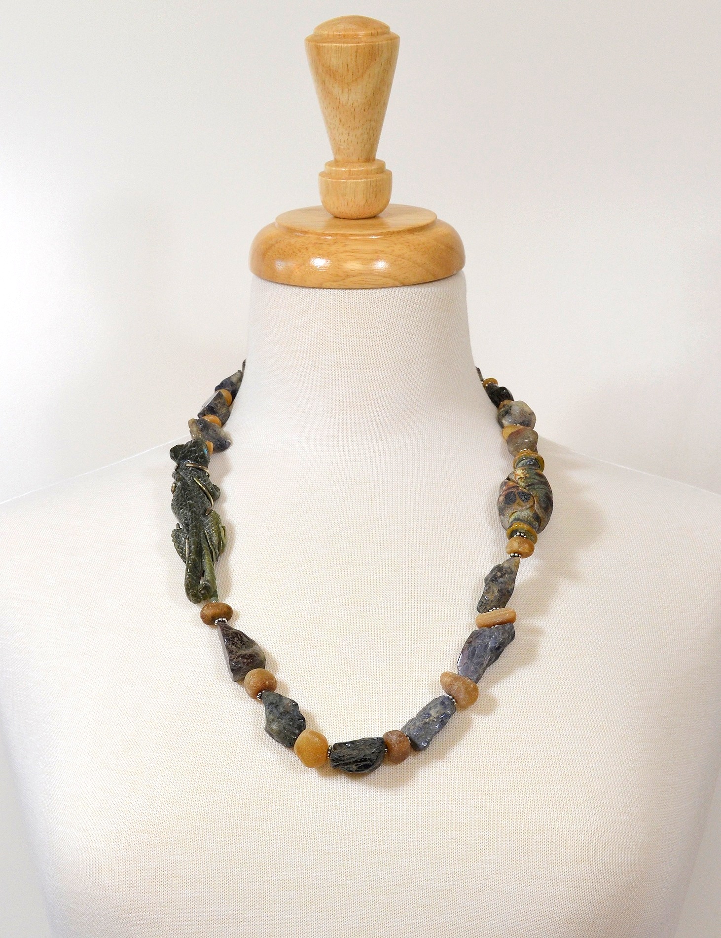 The iolite nugget strand was one of those orphans that I couldn't help but adopt. The pebbles are slightly polished, with shiny bits against the rough. When a strategy for dealing with Lizzie occurred to me, the iolite virtually leapt out of its drawer and announced how perfect it would be for this necklace.