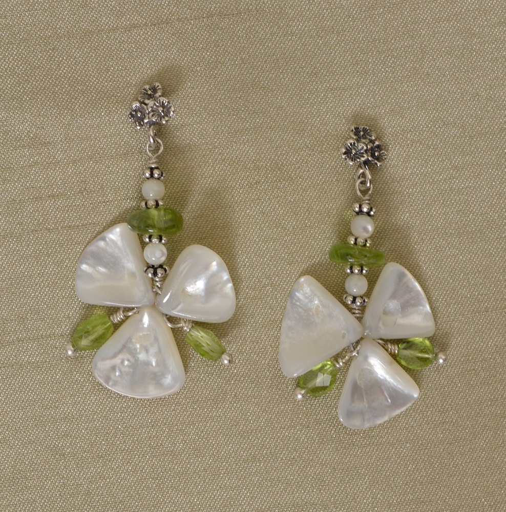 Lovely bright mother of pearl wings frame bright faceted peridot briolettes in this pretty necklace. The shell is shaped into thin wings to take full advantage of its inner iridescent nacreous layer. Nacre is produced by certain molluscs and continuously deposited throughout the animal's life, protecting the creature by encysting parasites and debris. The encystation can produce a blister pearl on the inside of the shell or a free pearl within the tissue of the mantle. The iridescence arises from the structure of nacre rather than from coloring agents. Nacre consists of alternating platelets of aragonite (plain old calcium carbonate) separated by sheets of an organic, elastic matrix. In addition to being beautiful, this structure also makes nacre extremely tough. The colors arise because the aragonite platelets are about the same thickness as the wavelength of visible light. It is the interference pattern that produces the different color effects. The natural (?) concavity of these shells amplifies this colorful effect.