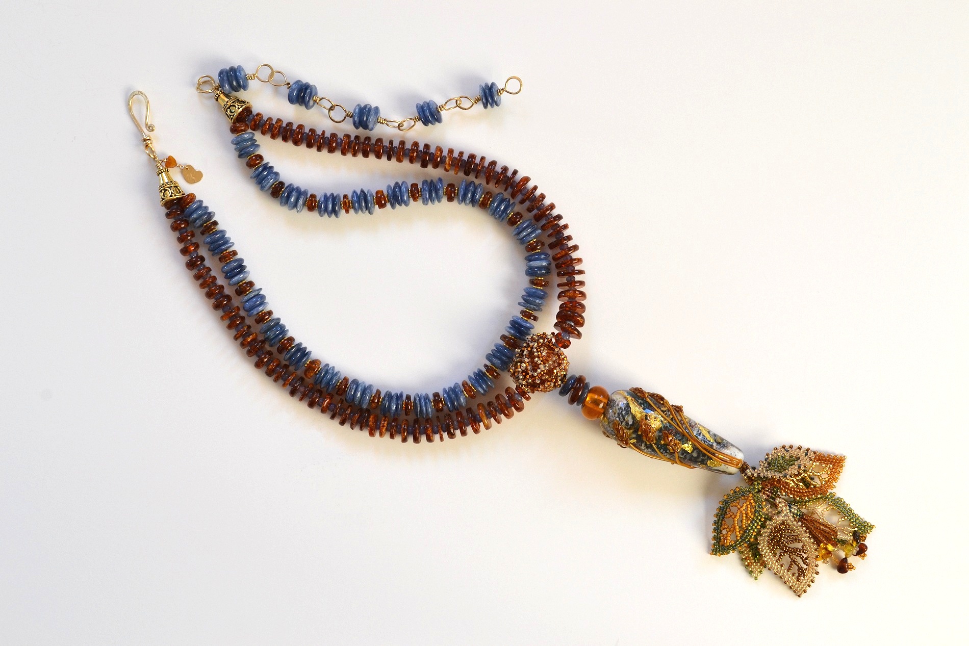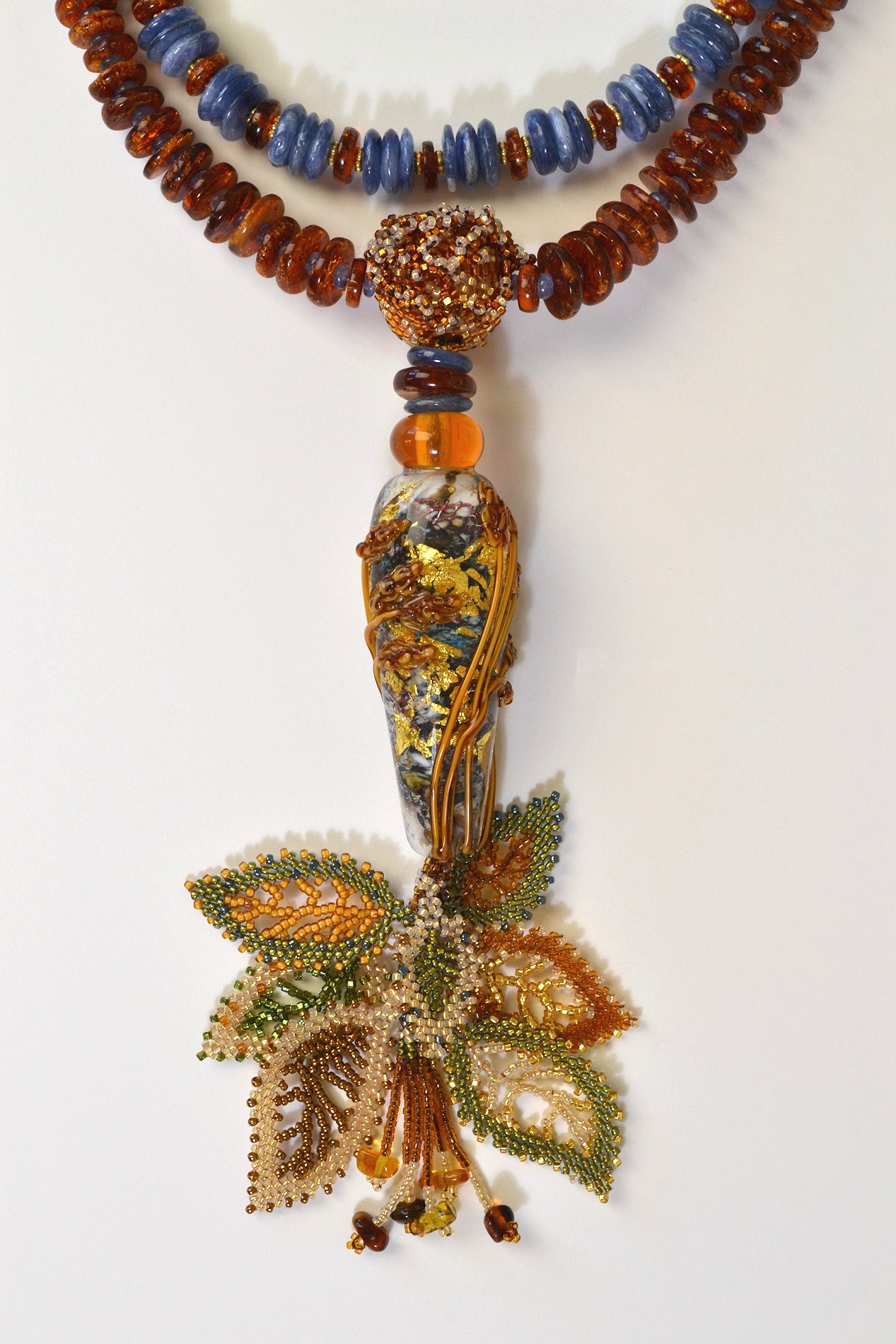 Please take a moment to look at the close-up of the amazing glass bead centerpiece. It takes extraordinary skill to make a large bead like this one, and extraordinary artistry to make it beautiful. If you've never tried to shape and decorate molten glass, perhaps you can imagine the difficulty of it! You start with a mandrel in your non-dominant hand and a rod of glass in the other. You heat the end of the rod of glass until it is molten and wrap it gently around the mandrel, taking care not to break off the bead release (a clay coating that allows the finished bead to be removed easily). You must keep the mandrel turning, otherwise the glass will simply fall onto the bench in a melted lump. You must also keep moving the entire bead back and forth in the flame, while turning it, to keep it heated uniformly, otherwise it will develop stress fractures that can't be healed. The different colors of glass are added a bit at a time, the bead is gradually shaped, the thin gold foil must be applied and encased quickly to prevent it from burning off, the entire bead is encased in clear... not exactly as easy as it sounds since you want an even covering of clear without the dreaded bubbles which can appear in the depths as you work. Once the bead is finished the surface details are added. Heat control remains crucial else the decorations will melt right into the bead. When the bead is complete, it must be annealed, i.e., "soaked" in a kiln at the annealing temperature of the glass. This removes residual stress from the glass and renders it strong and durable enough for wearing. If this sounds like great fun, it is! Start practicing!! If it sounds impossible, perhaps you will consider buying the work of fine beadmakers like Leah. Why, you could buy this necklace which incorporates her bead in a complex composition which includes amber interspersed with tanzanite, and blue kyanite interspersed with amber. A collection of Russian leaves contributes to the botanical theme.