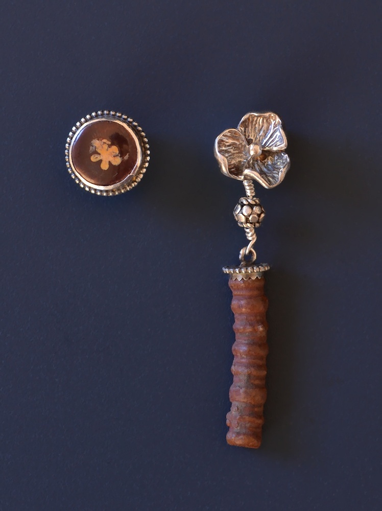 Everyone loves crinoids, don't you?! Show your love by wearing these teensy fossil earrings! The post on the left has a slice from a crinoid stem. The central axial canal or lumen contained a fluid-filled sac and nerve. Different types of crinoids have differently-shaped lumens, some are circular, some have 5-ponted stars, and some the little four or five-petaled flower shape of our example. The dangle earring on the right takes up the flower-on-top-of-a-stem theme in sterling and fossil crinoid stem. Wiki says that the largest fossil crinoid stem found is 40 m (130') long! The segments are clearly evident even in this tiny stem. Sometimes these segments separate in the fossil record as the connective tissue holding them together decays, yielding St. Cuthbert's beads, called by many names including fairy money, St. Boniface's pennies, Indian beads, etc.
