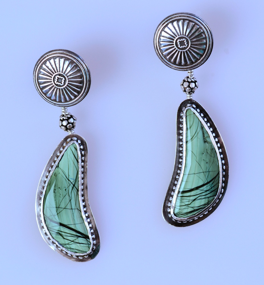 These superb slivers of Imperial Jasper seem almost to glow from within. Their color is incredibly rich for Imperial which most often has a softer, more greyed out, subtle look. Zenz discusses the Mexican locations where Gene Mueller reports large deposits and it is interesting to see that Ross mentions deposits near Wiley's Well in California. I think you will enjoy these lively earrings, won't you order them today?