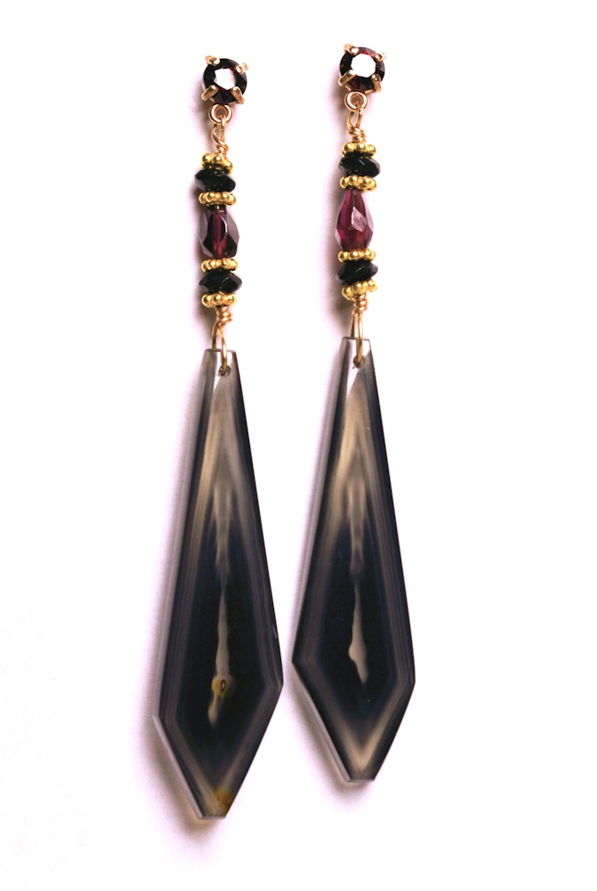 In his first Agates book, Zenz talks about the discovery of geometrically-shaped agates like the one from which these earring stones were sliced: "The impossible seemed to have happened, for most agates usually appeared in nodules, balls or irregular tunnels. Agates take on a crystalline form? Experts soon realized that these pieces could not be 'agate crystals' as their angles were totally irregular and no crystal shape could be determined..." Brzys mentions there are at least two theories of how they form, some think they are pseudomorph replacements of more angular crystals; others think these agates grew in hollow spaces between other crystals like calcite.