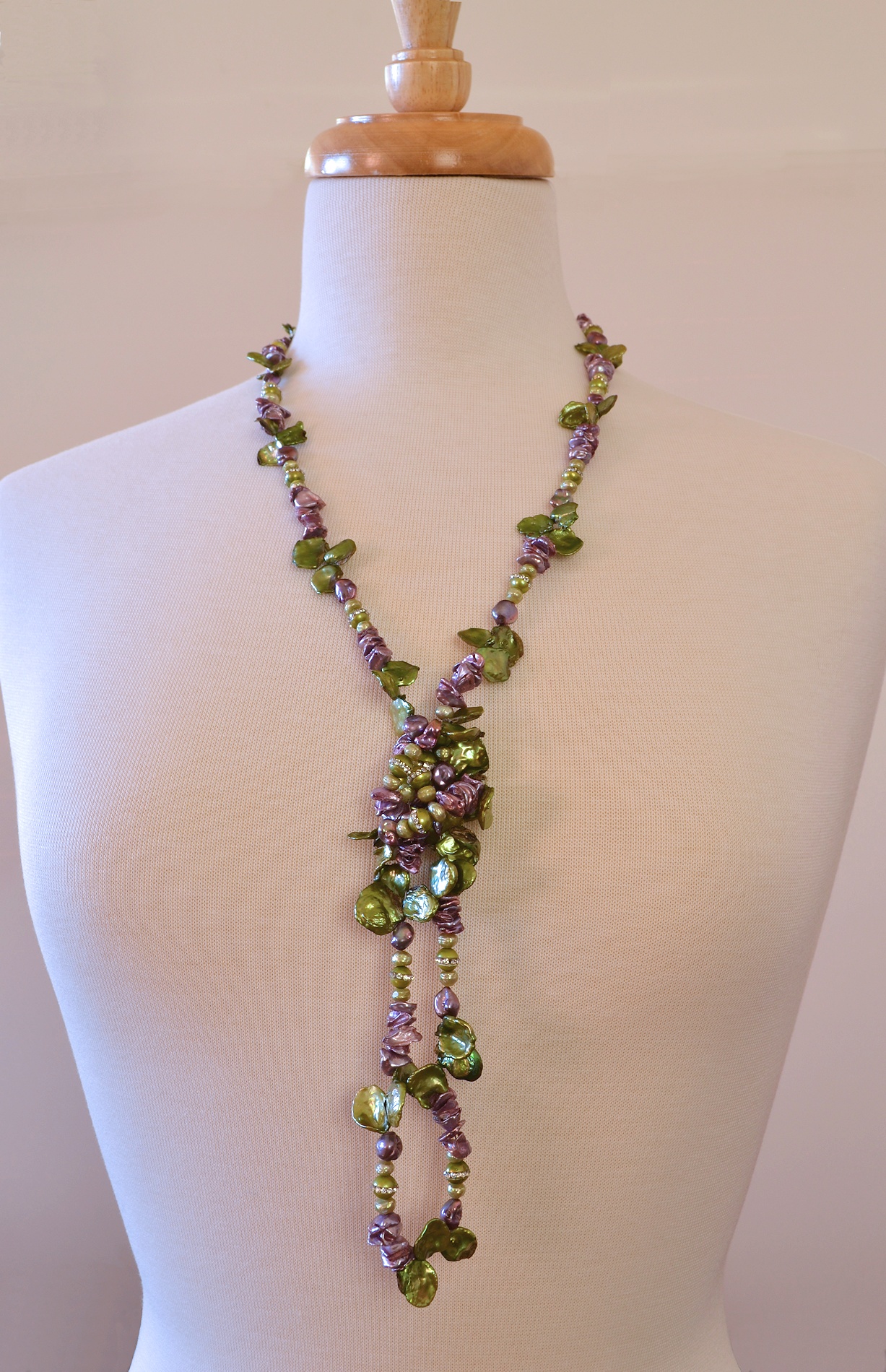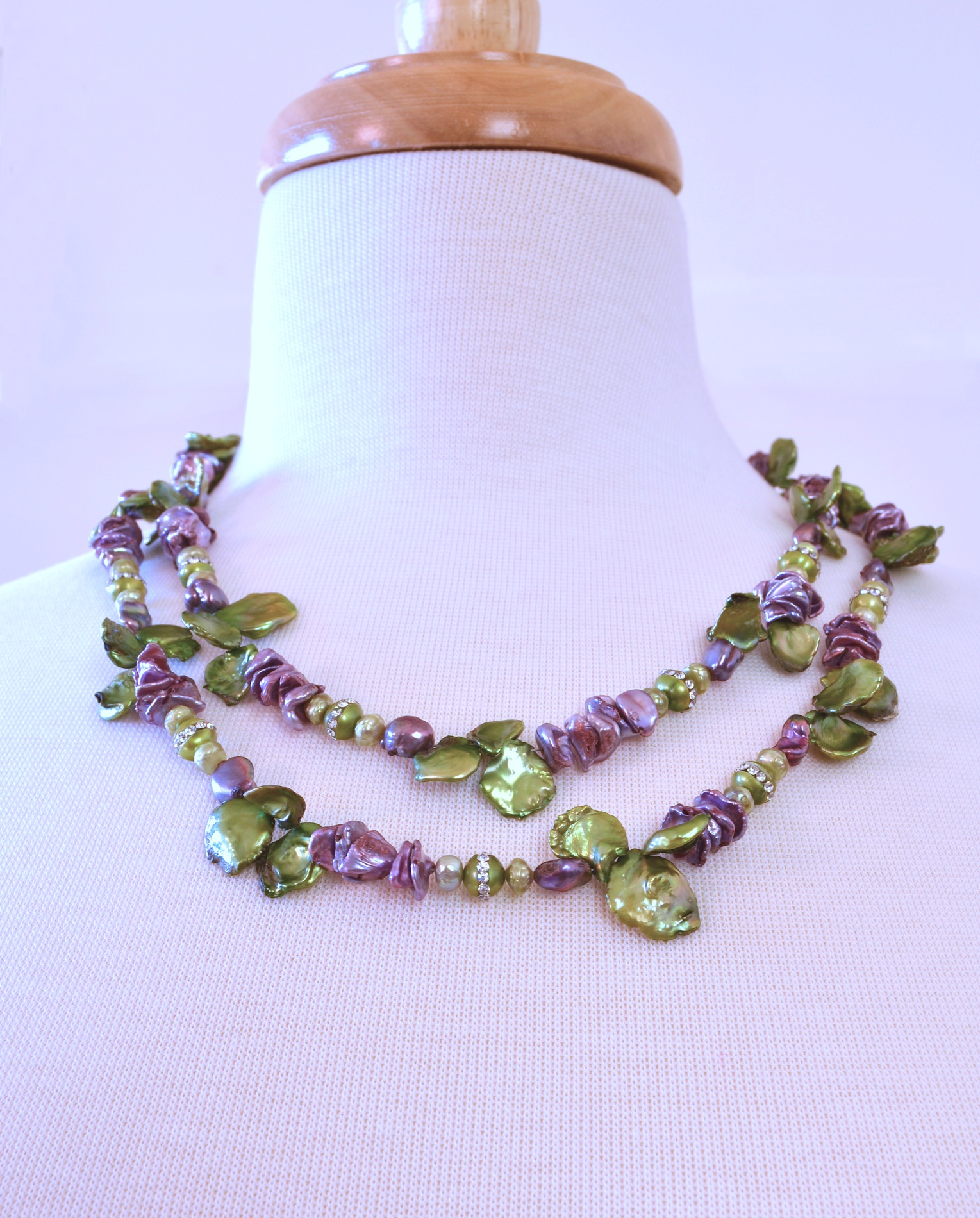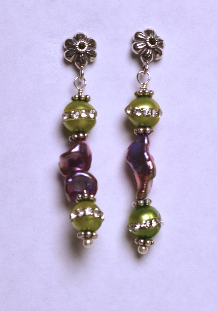 Pretty green and purple pearls, long enough to knot or wrap twice. Some of the green pearls have a ring of crystals around them which add sparkle!