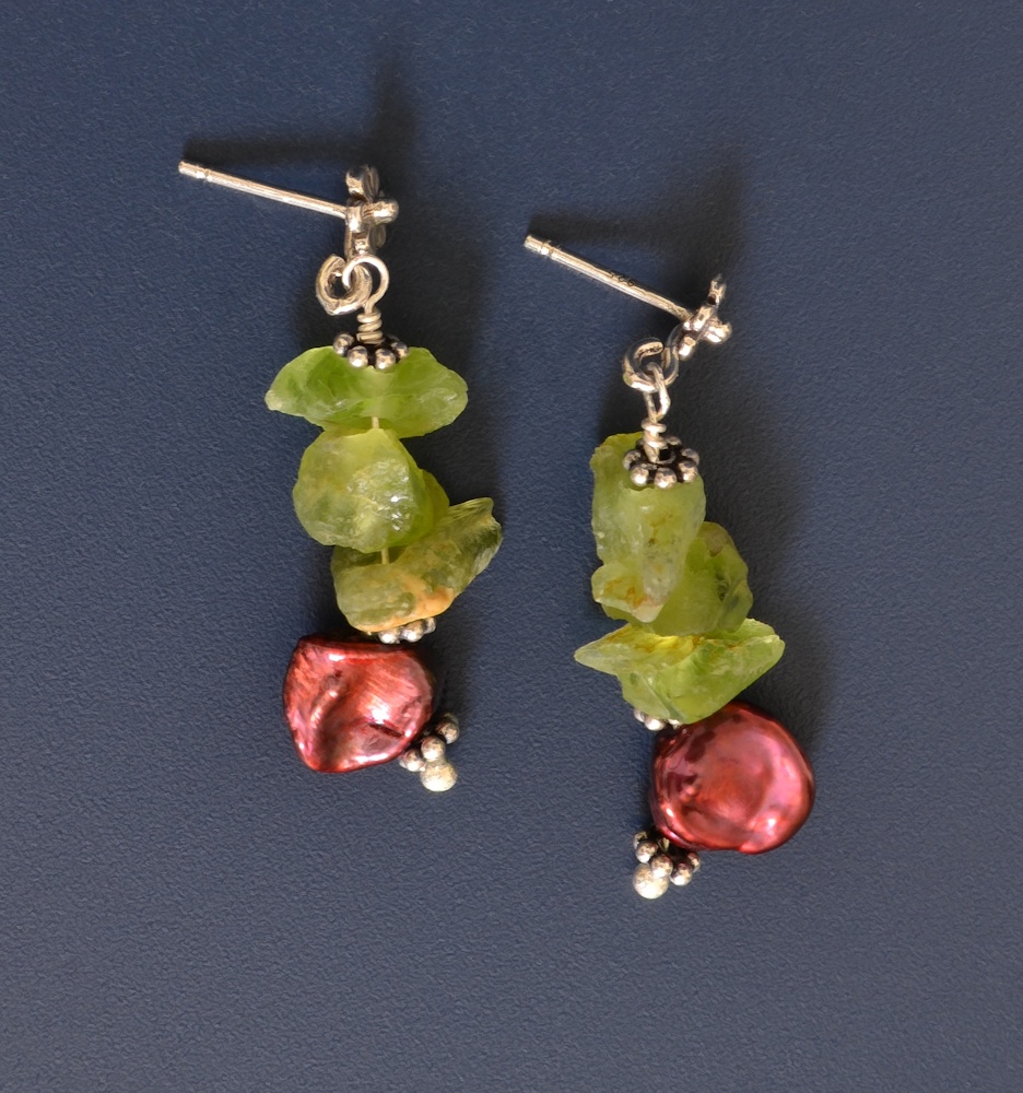 We talked at length about this stone and its ability to confer invisibility in relation to my Heliotrope Earrings. (Someday perhaps I'll write about the jacket I made that did seem to confer invisibility!) At any rate, Zenz notes that "contrary to many other cryptocrystalline quartzes (agate, jasper, chalcedony), this term [Heliotrope or Bloodstone] has always meant the same stone since the period of the classical Greece." It is mentioned in glowing terms in the Leyden papyrus (~250 A.D.). The little faceted Rubies around the cabochon are a good color match for the ruby colors in the stone so I purchased some beautiful rough Ruby beads certain they would be perfect for the composition! Alas, not so. The rough Peridot nuggets and large faceted Citrines were a much happier choice with a few ruby pearls to add color.