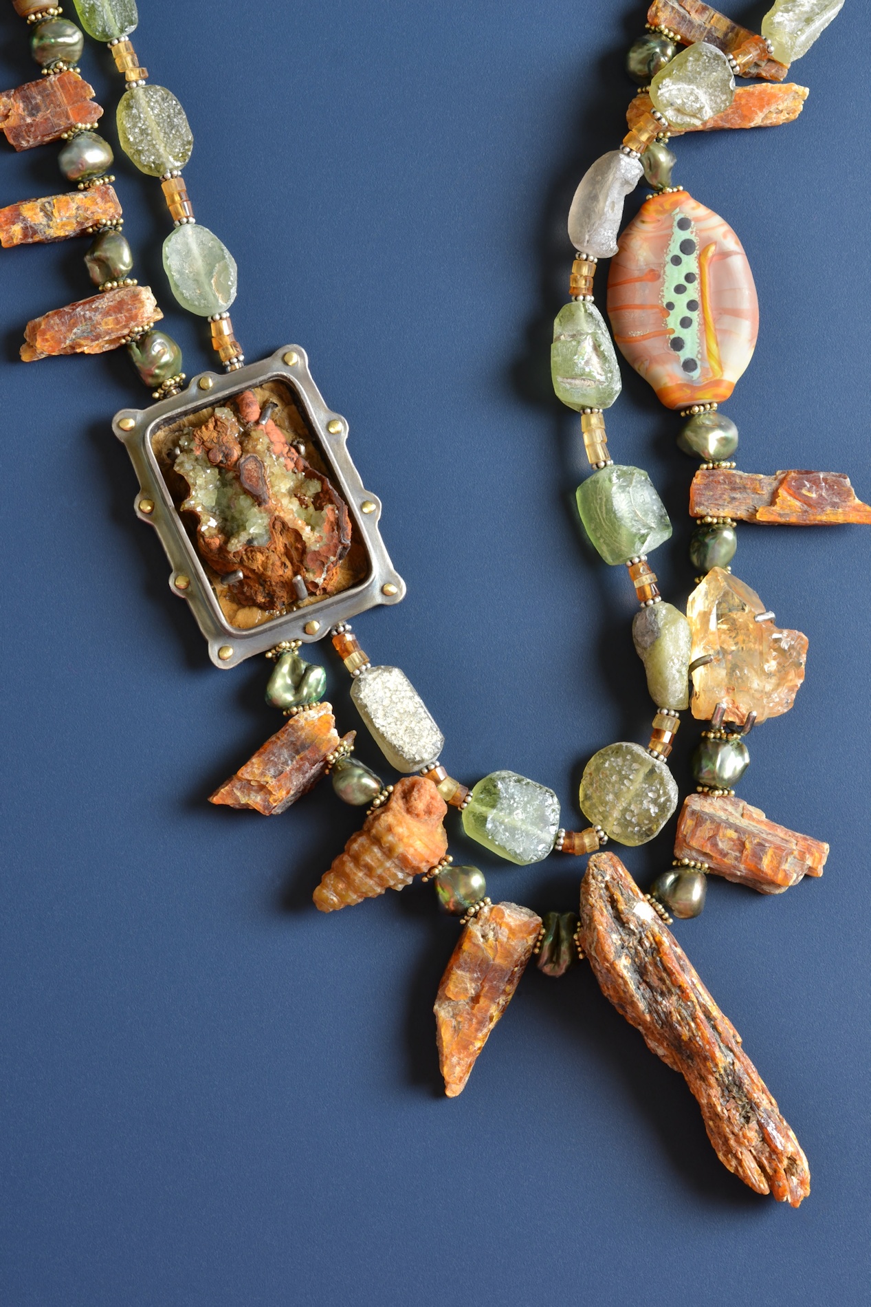 Unlike the orange kyanite, adamite is mentioned in our standard metaphysical texts. Melody says it can inspire avant-garde thinking, Simmons mentions taking on whatever challenges must be faced. Ahsian mentions it can help in creative problem solving... so do you think it helped me design this necklace or that I failed it somehow? Maybe it encouraged me to add the little topaz, "stone of true love and success in all endeavors" Melody claims. Which leads us to the issue of how a crystal with one termination should be oriented. For some reason the idea that the point should be up to draw the stone's energy down to the wearer makes sense to me. (Point down is said to release energy, e.g., negative accretions.) Others have different views, such as point up directs energy to upper chakras, point down has a grounding effect. I made this piece the way I thought it wanted to be made, and curiously wound up with the little topaz over the heart where I subsequently found that many think a crystal should be worn.