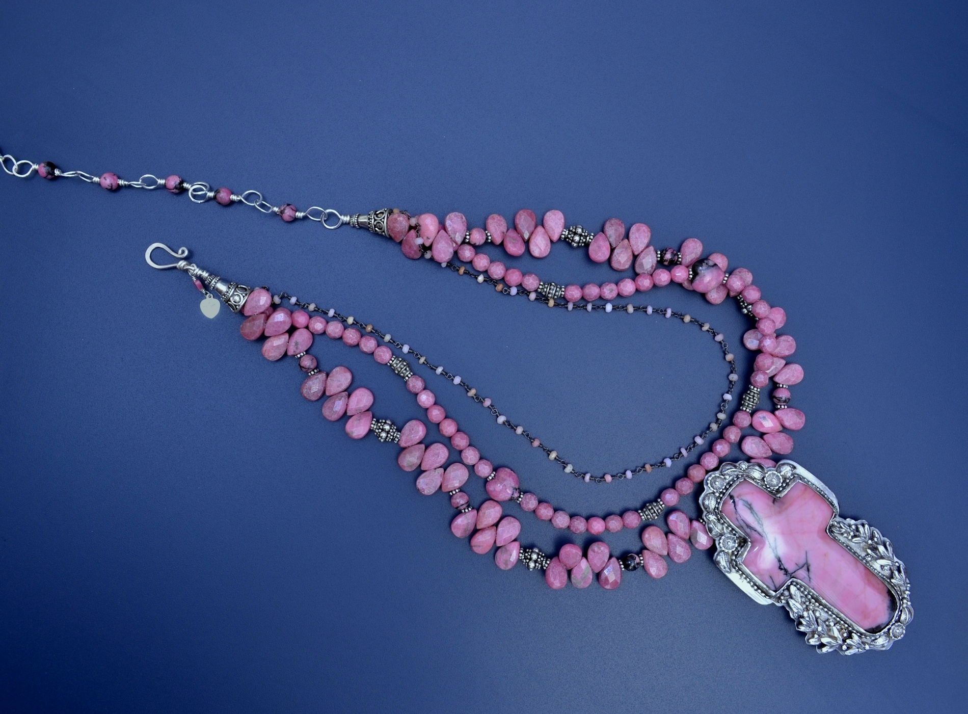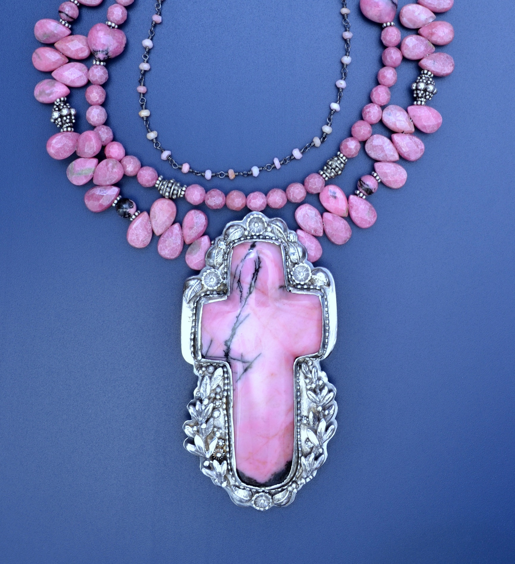 Rhodonite is a fascinating choice for a cross as Ahsian says that it "helps one to understand one's purpose, as revealed by one's gifts or abilities ... and to perfect them for the highest good." It is certainly helping me understand the limits of my abilities insofar as I made a beautiful pair of earrings to go with the cross using matching stones but didn't like the way they were hanging. So I promptly ruined the settings by trying to fix them in a hurry. I have now re-made the settings from scratch thus I hope having my skills increasingly perfected toward the highest good.
