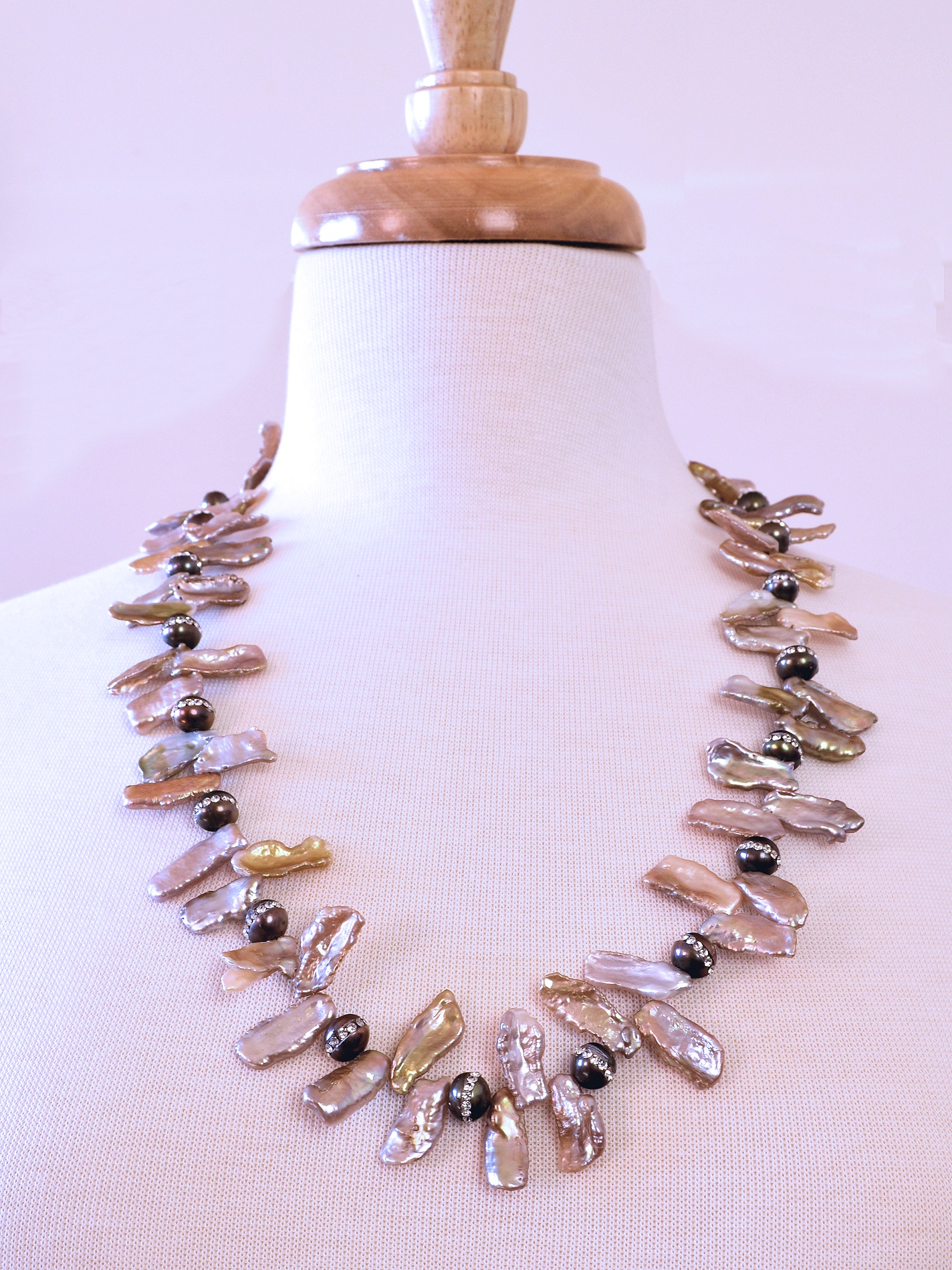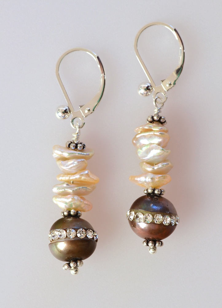 Here is a very pretty collection of pearls including dark taupe pearls which have a ring of very sparkly crystals around their circumference. You would think I would be the last one to make something with crystal-encrusted pearls, but these little sparklers are so pretty I couldn't resist them.