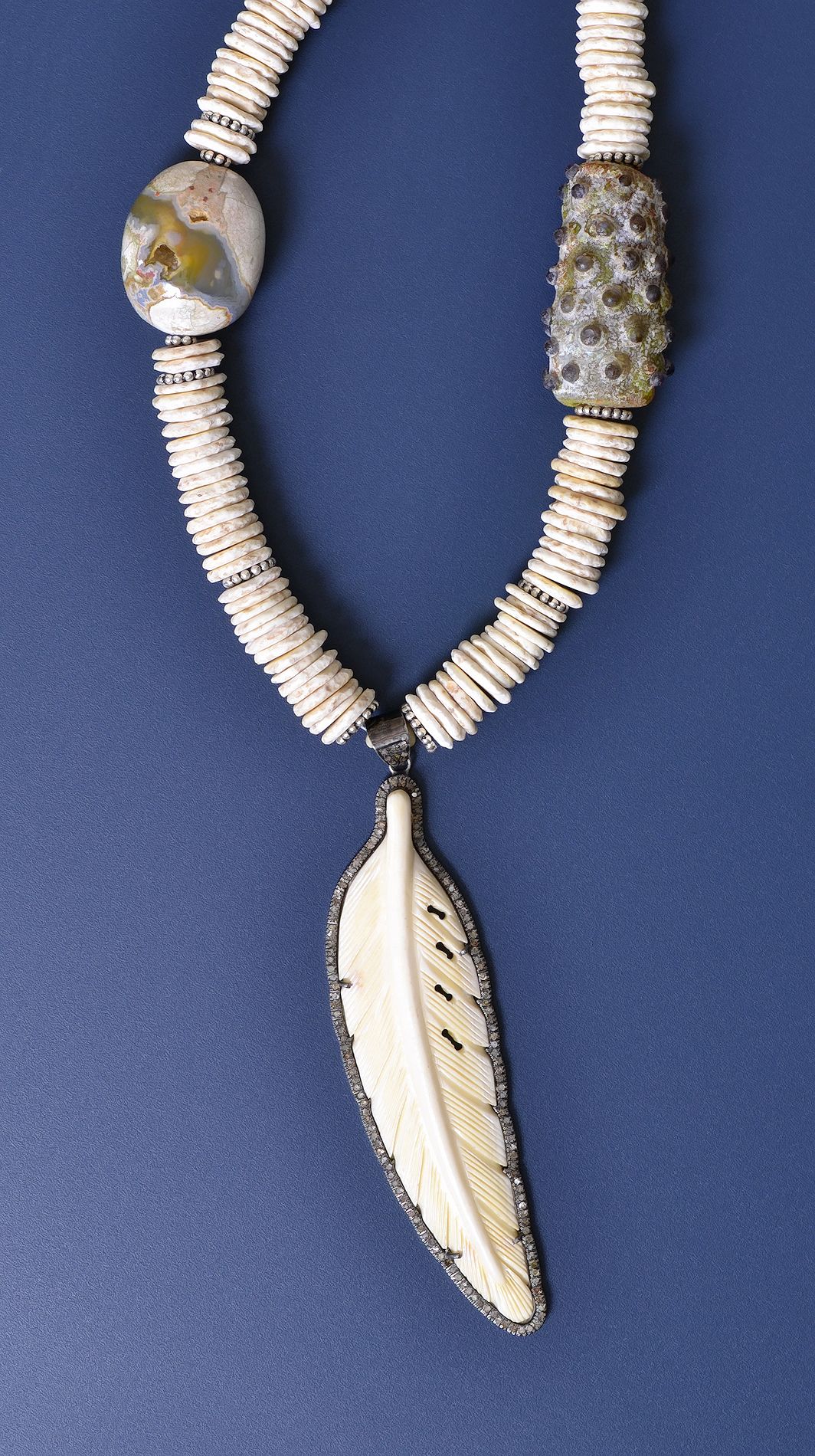 How odd: a carved bone feather surrounded by diamonds?! I rarely use diamonds, whatever possessed me to buy this feather? Perhaps, like the crow, I couldn't resist the sparkle! Obviously (isn't it annoying when people say, "obviously?" Forgive me, I mean it to be amusing, as it "it was obvious to me but you can call me a nutcase") obviously the feather demanded ostrich eggshell beads, a thunder egg and a handmade glass bead.