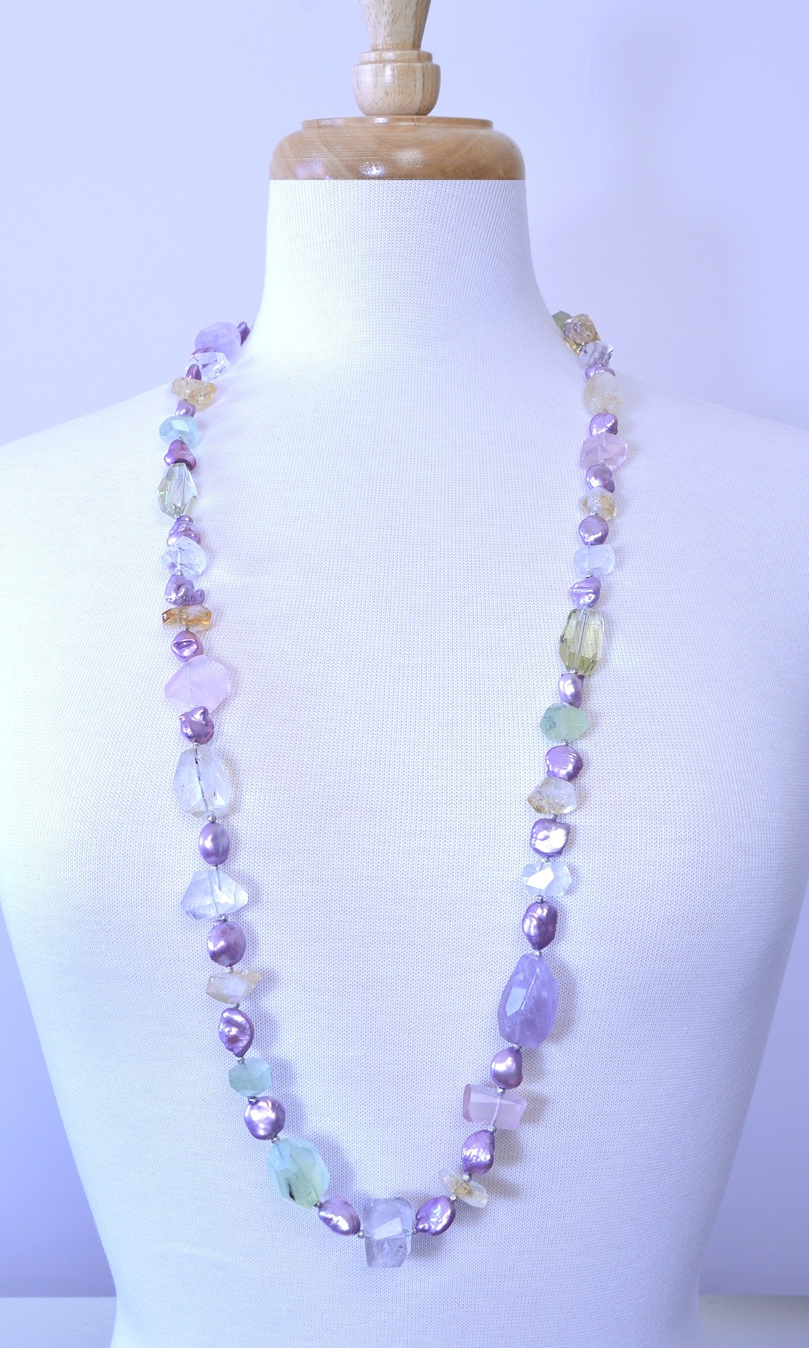 This delicately colored strand of gemstones and pearls can be worn long or wrapped into two strands. The stones seem to almost cuddle together and radiate positive, healthful energy. I hope you will enjoy wearing this lovely collection.