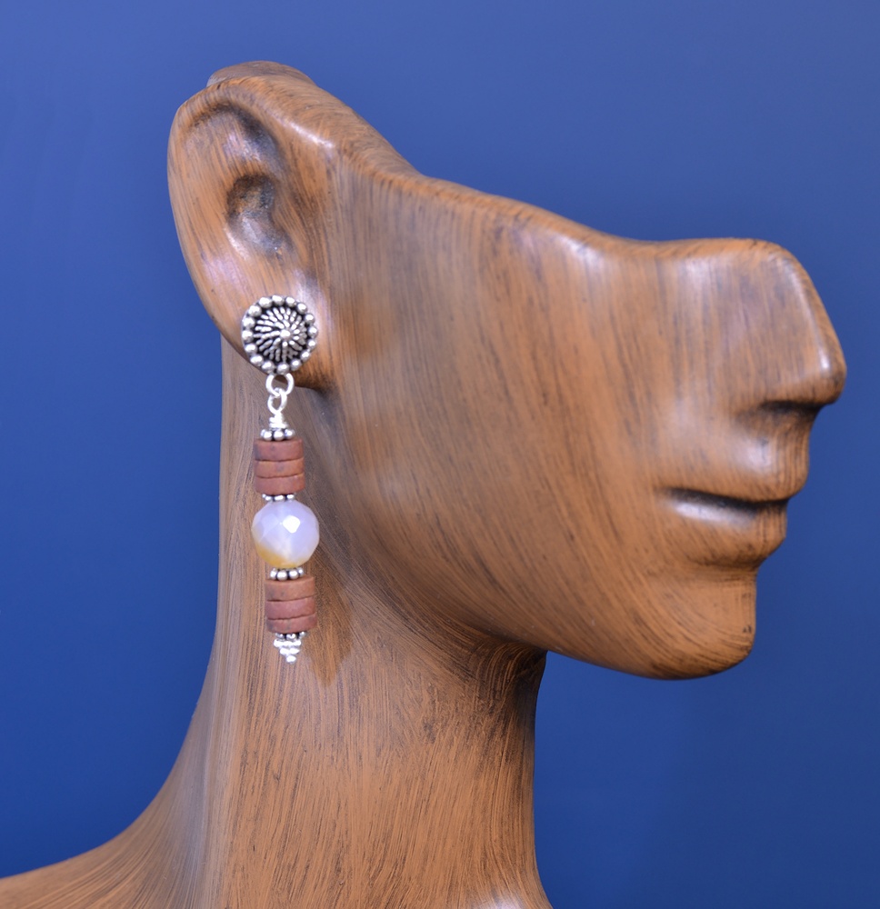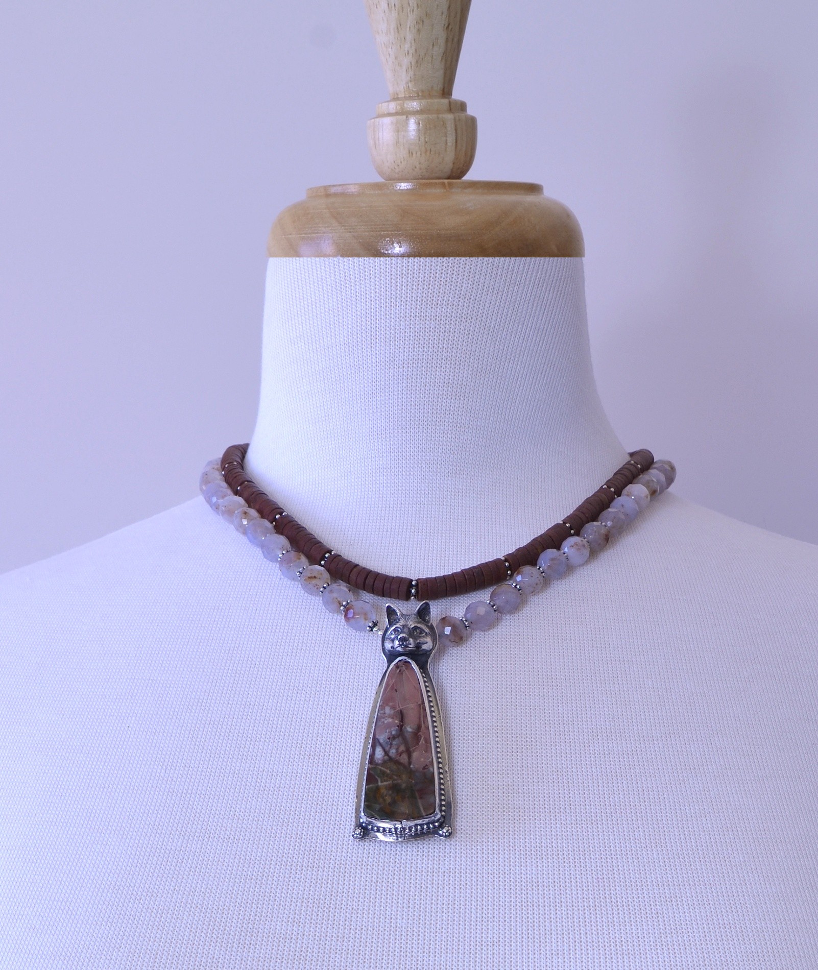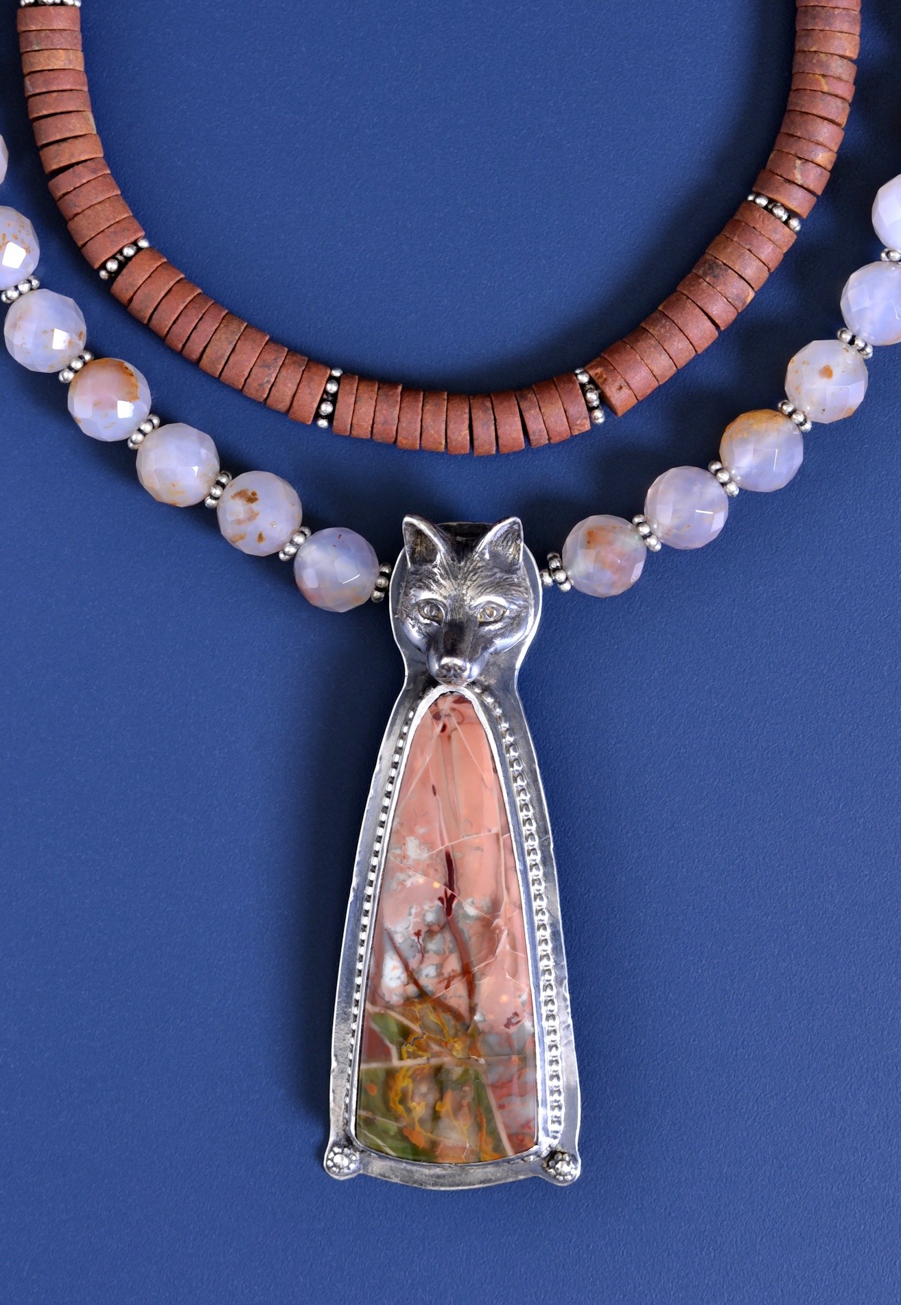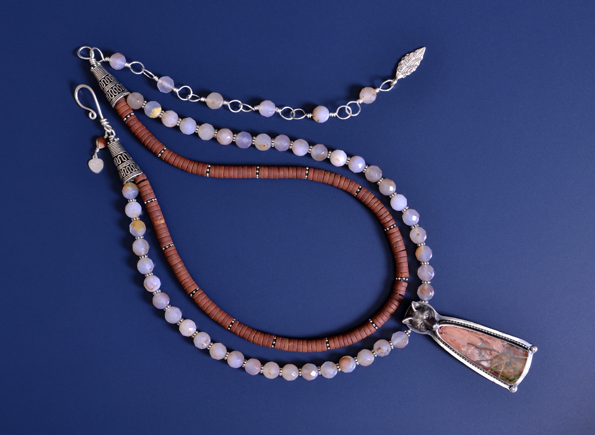 Many years ago, before I was familiar with it, I was given an old strand of Chalcedony beads as a gift from a friend's estate. When I saw them I thought how odd it seemed for the woman to have had such a seemingly dull, grey strand of beads (she had exquisite taste). Then I picked them up and felt overwhelmed by their beautiful spirit. When I touched them their appearance changed completely for me. The beads in this necklace have that same lovable quality as well as a bit more color! Chalcedony, said to encourage brotherhood among all, is a member of the quartz family and takes many forms with different names, including agate, petrified wood and jasper. The difference between the beads and the centerpiece is that the quartz in Chalcedony is arranged in fibrous layers whereas in jasper it occurs in sugar-like grains. It may seem odd to pair the translucent Chalcedony with the opaque Morrisonite, but they love one another and I think you will also feel their sweet familial relationship when you wear the necklace. The Chalcedony beads highlight the grey and rusty colors in the Morrisonite in an interesting way and the Serpentine beads blend with the colors in both. Ahsian says Serpentine is soothing to the emotional body.