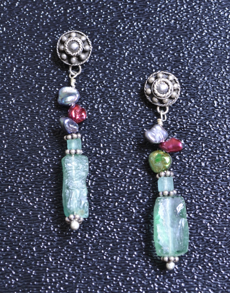 Rosasite in Iron Hat, who can resist it? Rosasite, Wiki says, is a copper-zinc carbonate hydroxide. Iron Hat is a type of gossan, an exposed, oxidized portion of a mineral, in this case a rust-colored outcrop of iron ore. The Rosasite specimen has beautiful crystal blades growing out of its greenish botryoidal crust. Its highly textured surface made it a challenge to set. For some reason it seemed obvious to me that it needed a "head" and the beautiful pale amethyst rosette seemed perfect, giving the creature a happy radiance. Tiny Aventurine cabs sit on the prongs. The colors of the old Afghani Roman glass blend perfectly with the Rosasite. A few natural Quartz points amplify the energy of the piece.