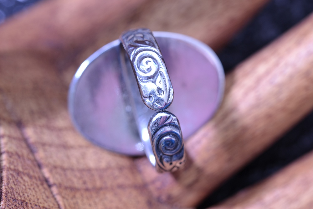 The high-domed stone is set in sterling with a substantial domed floral-patterned band. It is adjustable, and the somewhat larger size gives the option of wearing it on the index or middle finger as well as the ring finger. Please order it today, there won't be another like it!