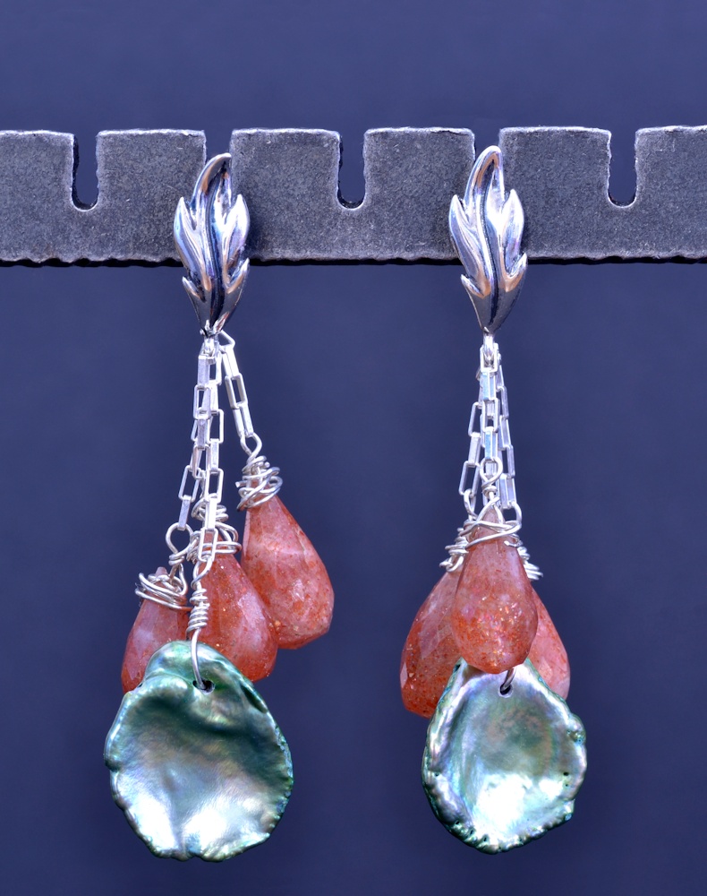 The Sunstone in this necklace most likely came from Oregon. The detail photo shows one of the briolettes that looks like it is lit from within. You can see it is full of spangles and conveys how much sparkle (schiller) these stones display. The spangles and density of color are related to the amount of red copper inclusions in the stones. Simmons calls it a stone of personal power, freedom and expanded consciousness. Melody mentions it was used by Canadian Indians in medicine wheel rituals. Note that our Sunstone is not related to the fascinating "sunstone" (possibly calcite) which was used in a most clever way to enable medieval navigation.