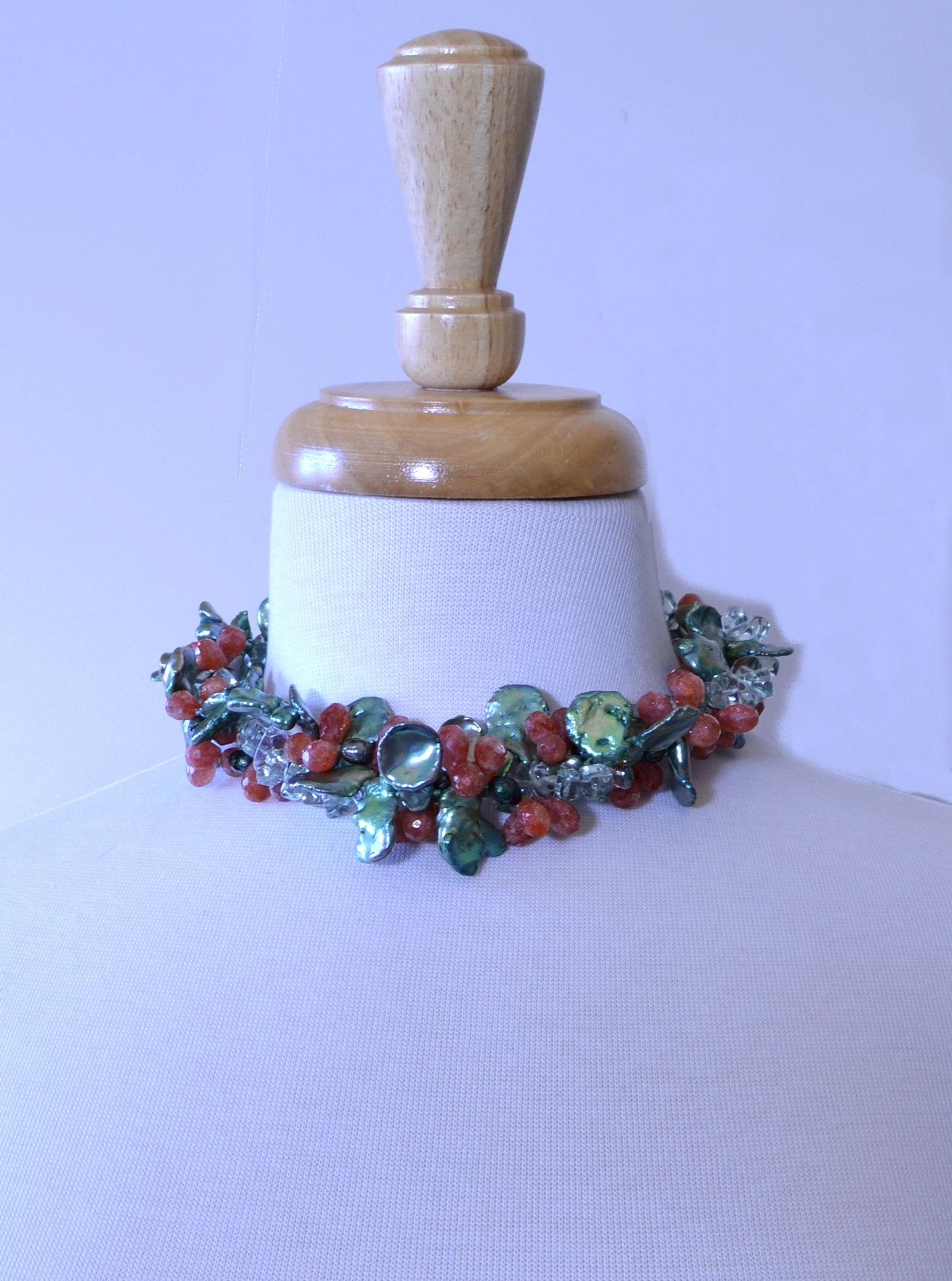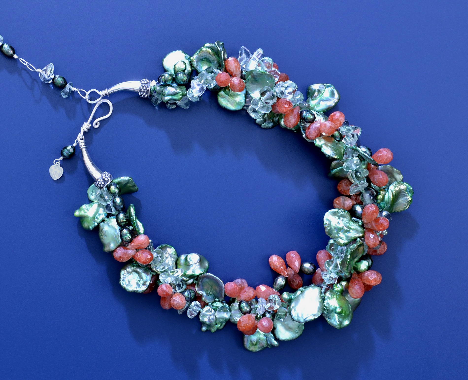 This is a three-strand necklace which is shown braided so it makes a luscious collar. The three strands can be un-braided if you prefer. One strand has the big, flat Chinese keshi pearls. Another strand consists of smallish, clear Prasiolite (green amethyst) chips. The third has incredibly sparkly, densely-colored Sunstone briolettes with small dark-green faceted pearls interspersed.