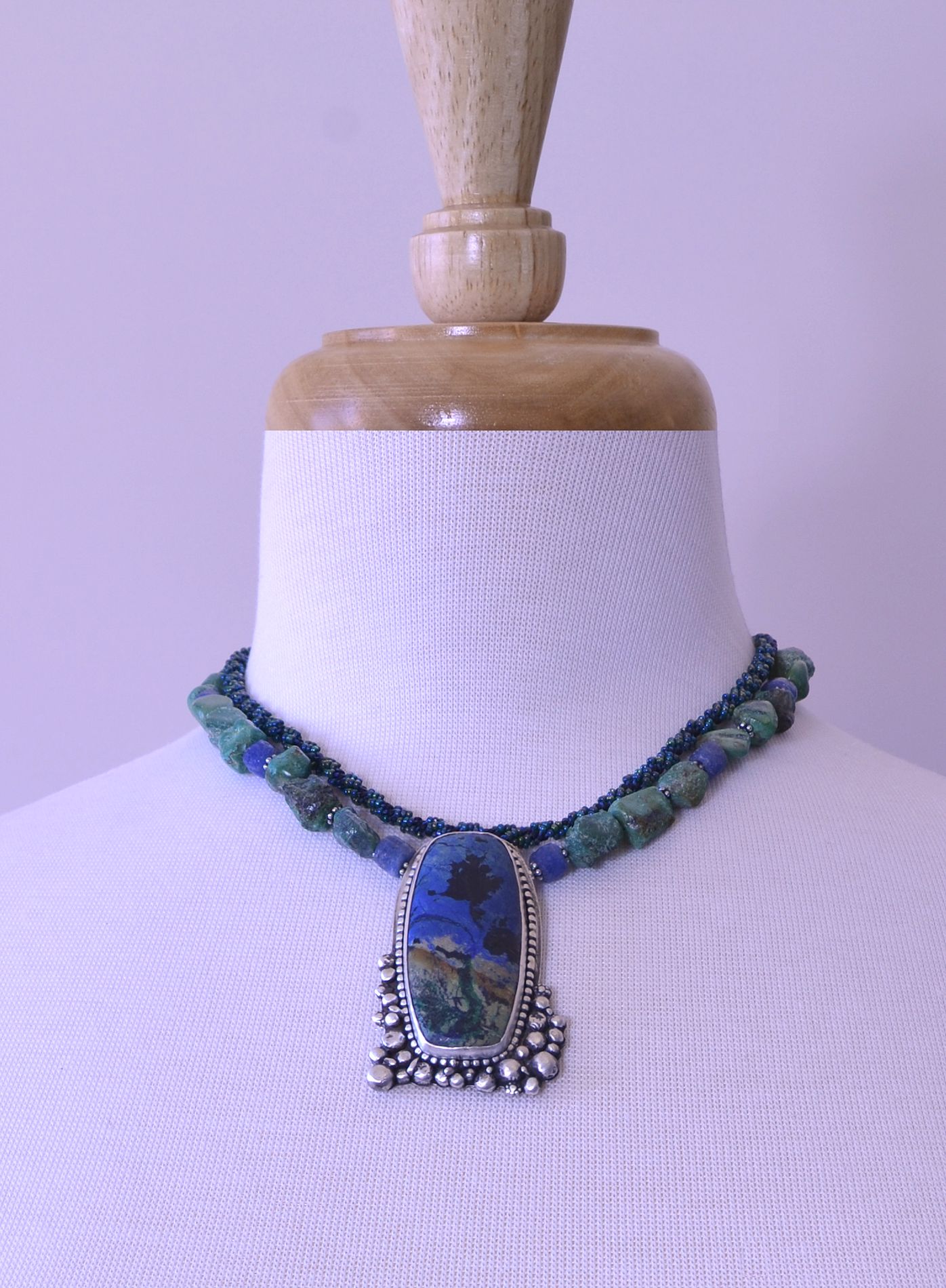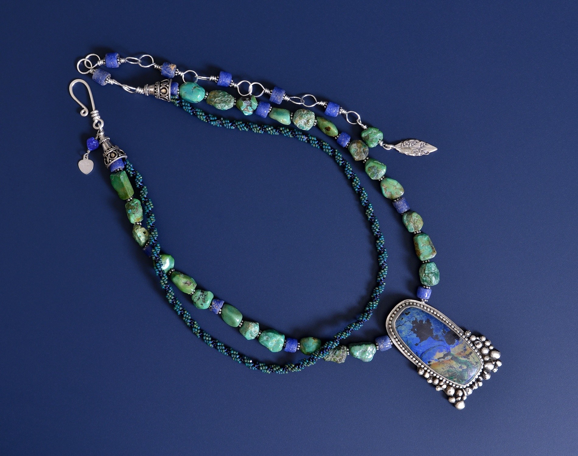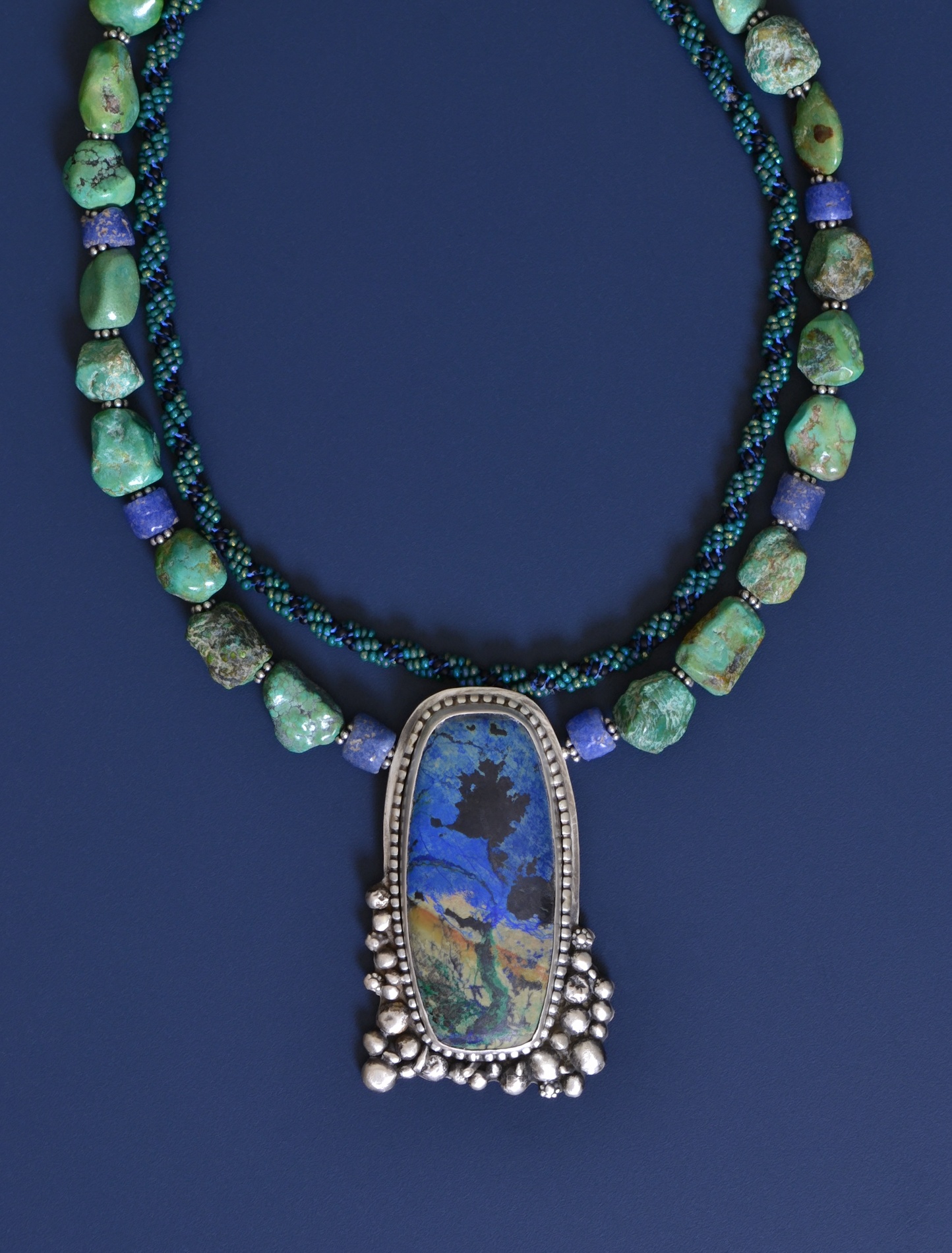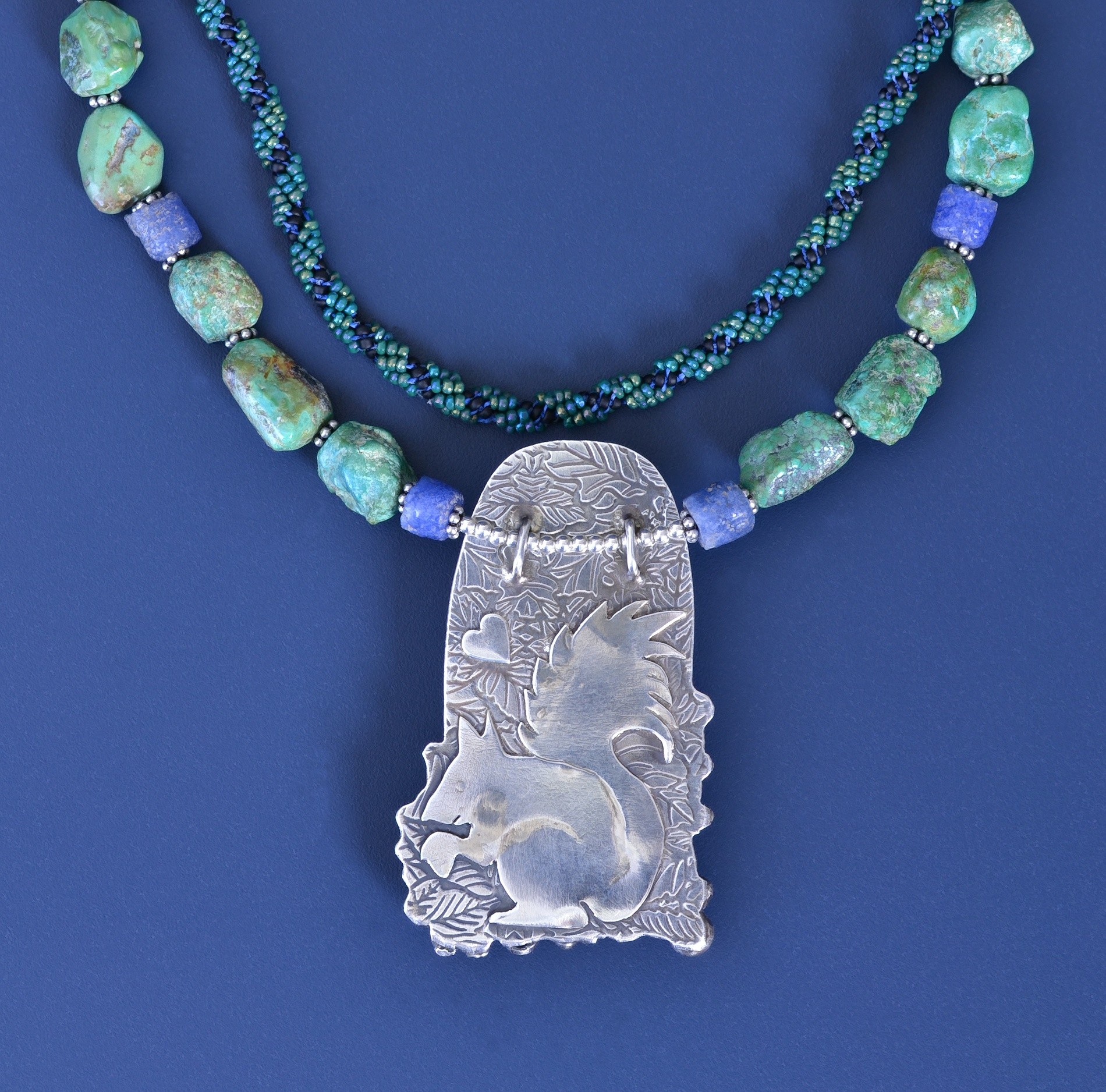 Here we have a little rock with a mix of azurite, malachite and other minerals which have magically come together to form the image of a tree clinging to a steep, windswept desert hill. Gary put a matte finish on the stone, complementing the rugged environment. I put a little squirrel on the back to enjoy the landscape. The necklace has rough sand cast blue glass beads and lightly tumbled turquoise nuggets, as well as a seed beaded chain to pick up all the colors in the centerpiece.