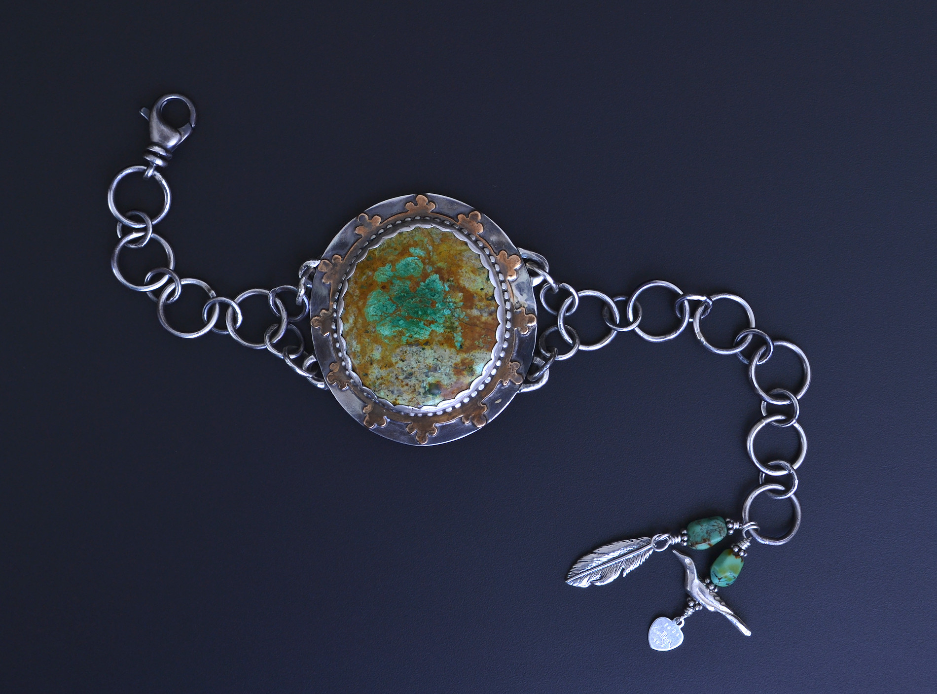 A pretty blossom blooms in a hand-cut Arizona turquoise. You can hook the lobster clasp into any of the rings of the chain, so the bracelet will fit almost anyone. A "Hooker" tool is included which can help you hold the chain while you hook the clasp. Many people can hook it easily without the tool, but one is included just in case.