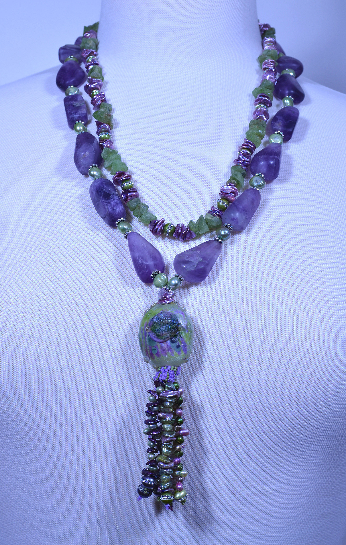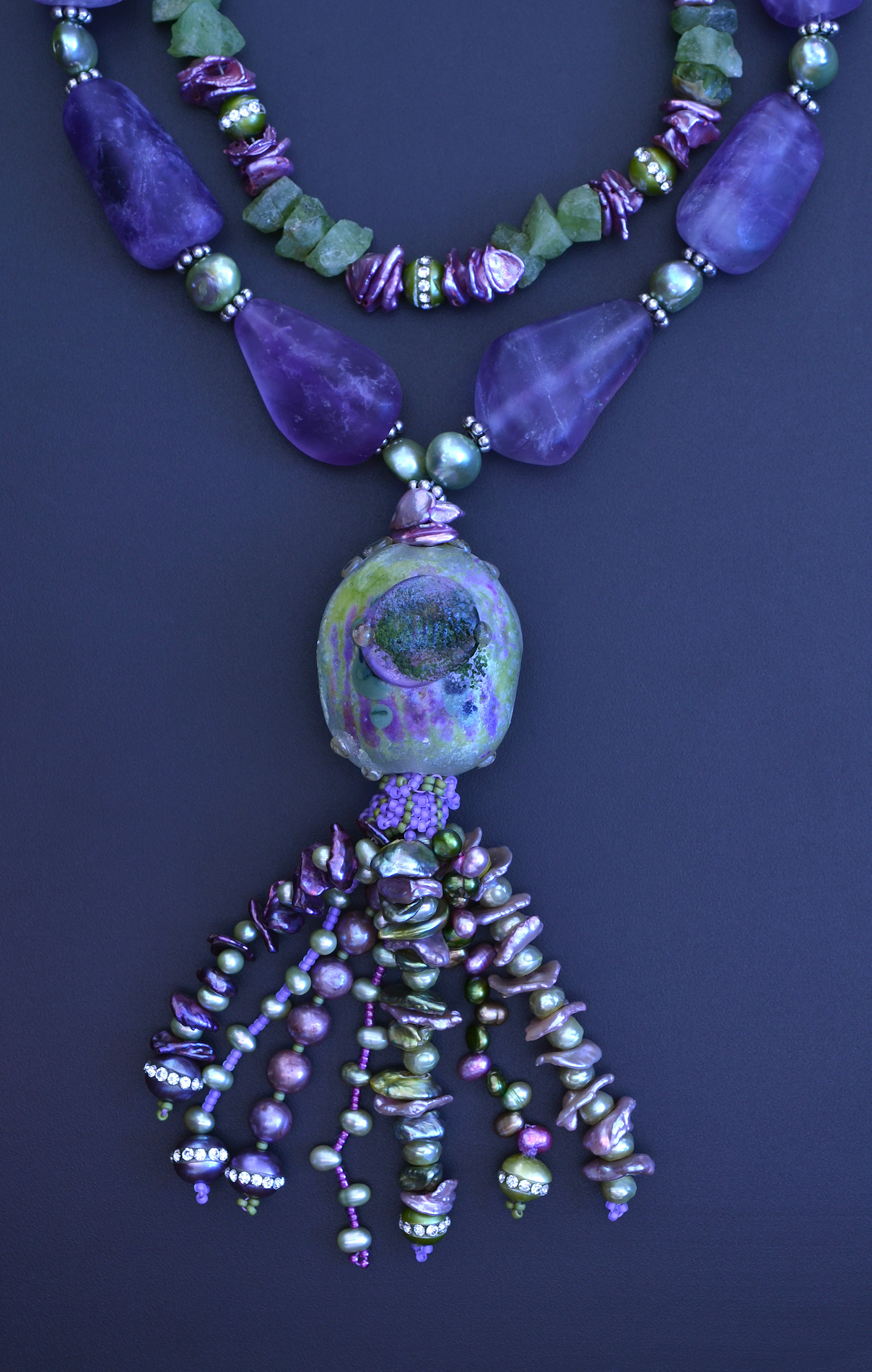 Sometimes the little freshwater pearls with CZs inlaid around their tummies call out to me. This time it was a strand of yummy green ones which are interspersed here with rough Peridot crystals and large, richly-colored matte Fluorite beads. (Please note that this is a heavier necklace because of the large stones in it.) I was looking for pearls and stones to go with Karen's centerpiece bead and it came together after I brought home the Fluorite beads without knowing what I planned to use them for... oh, there it is sitting right there on my table! Melody says Fluorite is a stone of discernment and aptitude so apparently these stones had more discernment than I did when I found them and leapt into my hands demanding I buy them.