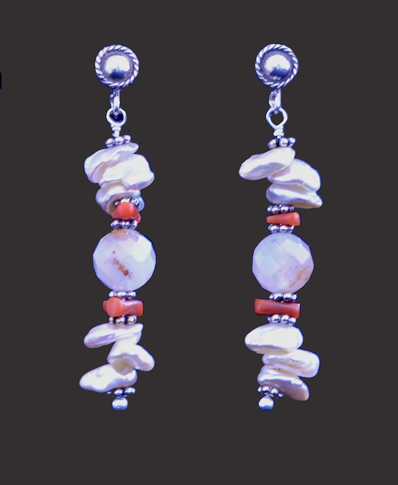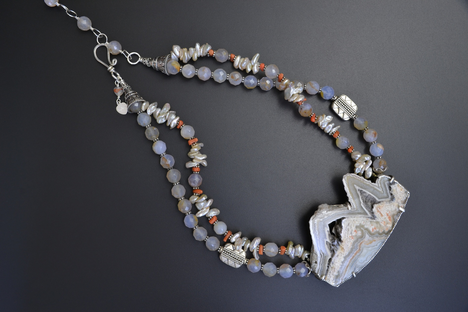 This fascinating Banded Agate wanted nothing from me except a way to attach its friends, the Chalcedony beads (Agate is the banded form of Chalcedony). The invoice notes that the "lace" in this stone is Calcite pseudomorphs, meaning the Agate replaced Calcite at some point forming the lace pattern. The old rather faded coral blends nicely with the tiny specks of orange in the stone and in the Chalcedony beads.