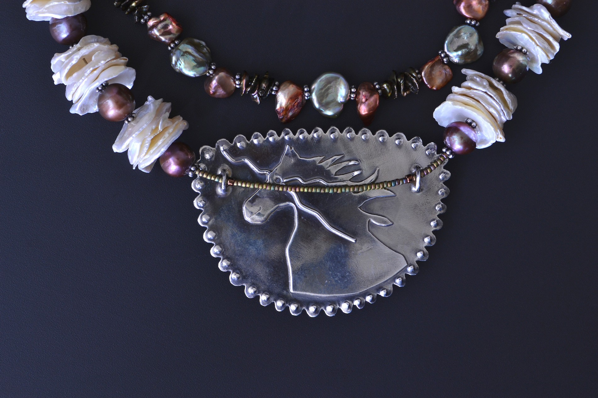 The centerpiece stone is a Butterfly Agate with an astonishing portrait of a wild-eyed pony. Check out the second image down which shows a detail of the pony whose head is in the upper middle of the stone. He is looking to his left as lightning flashes from his eyes! A bit of his strong back is at the lower right, his galloping leg on the left. Don't see him??? Oh dear! I put his silhouette on the back (4th photo down), I do think he will pop out for you if you switch back and forth between the front and back views.